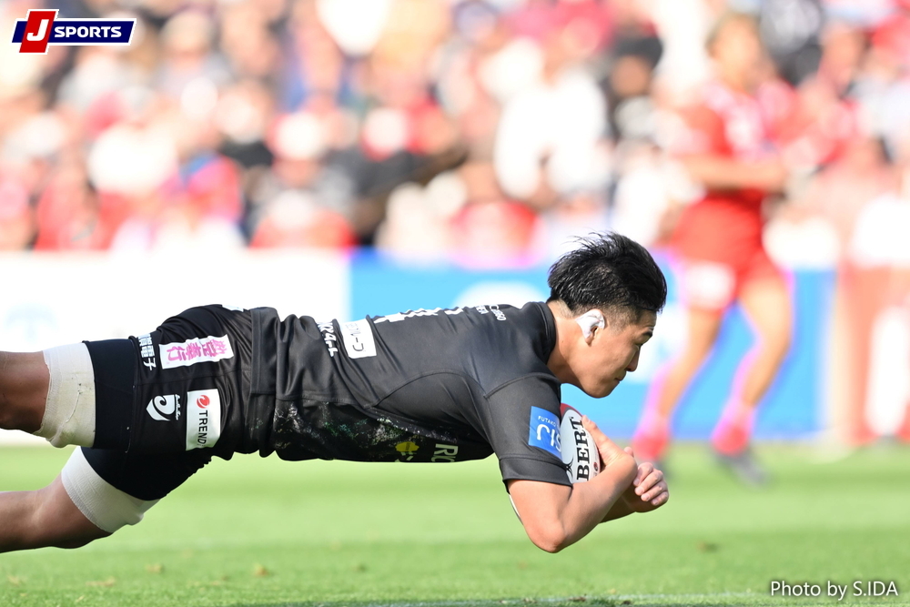 互角の展開のなかで先にトライを取ったのはBR東京だった。前半13分、SHのTJ・ペレナラがトライライン直前のPKから速攻を仕掛け、最後はNO8ブロディ・マクカランがトライ。ゴールも決まって、7-0となる。25分、BR東京がラインアウトからの攻撃でLOハリソン・フォックスが右コーナーにボールを押さえたが、ここは映像判定になり、ラインアウトでディフェンスを邪魔するオブストラクションがあったとして、トライキャンセル。しかし、直後にチャンスを作ったBR東京は、マクカランの突進でできたラックからWTBセミシ・トゥポウ、FLリアム・ギルがボールをつなぎ、最後はLO山本嶺二郎が中央トライ。FBメイン平のゴールも決まって、14-0とリードする。