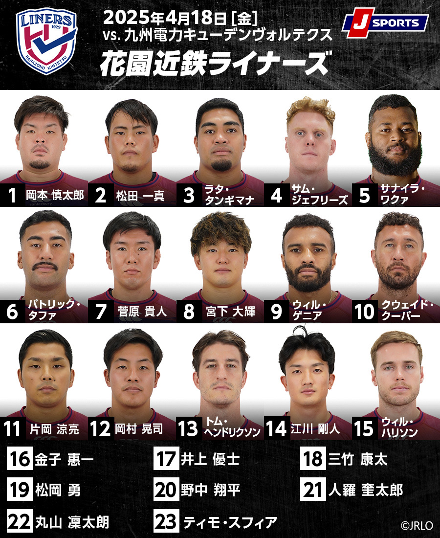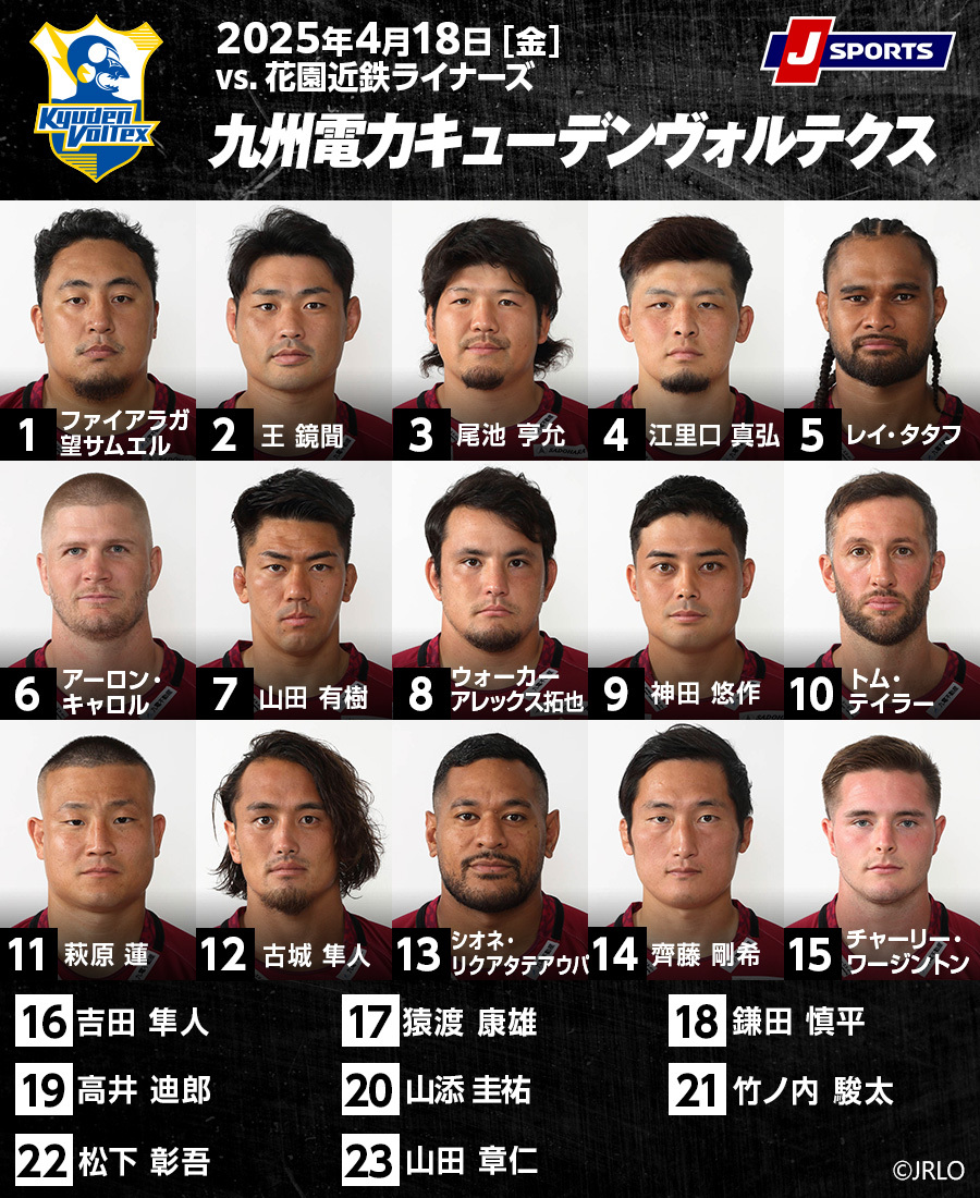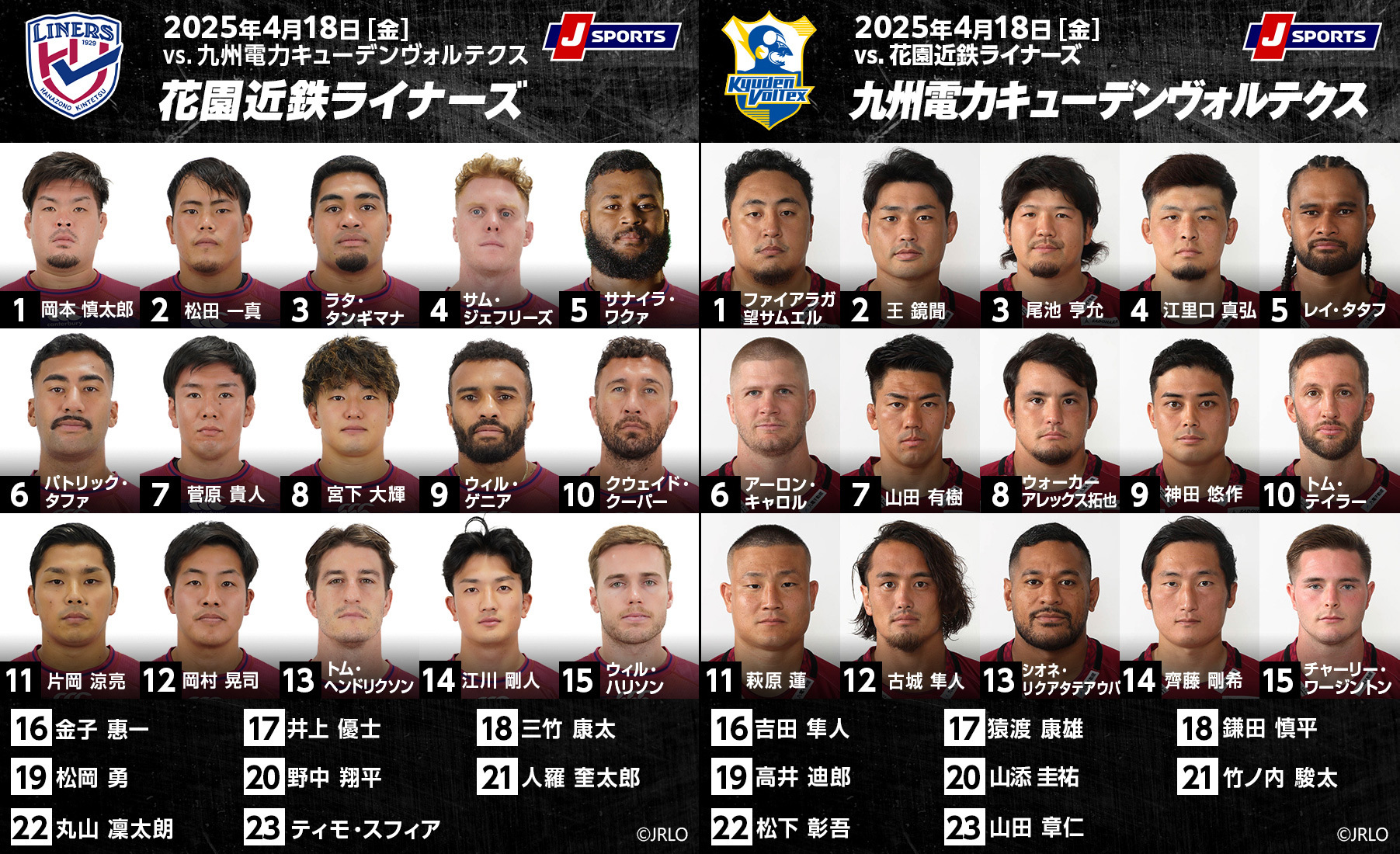 今節のメンバーは、前節から先発15名で8名という大幅な変更がある。PR(1番)はファイアラガ望サムエル、PR(3番)は尾池亨允が前節のリザーブから先発へ。FL(6番)は中島謙に代わってアーロン・キャロル、FL(7番)はコルビー・ファインガに代わって山田有樹が入る。SHは神田悠作が第9節以来の先発。CTB古城隼人、WTB齊藤剛希もリザーブから先発へ。FBは加藤誠央に代わって、第7節以来の復帰となる21歳のチャーリー・ワージントンが入った。ベテランのWTB山田章仁は23番を背負う。