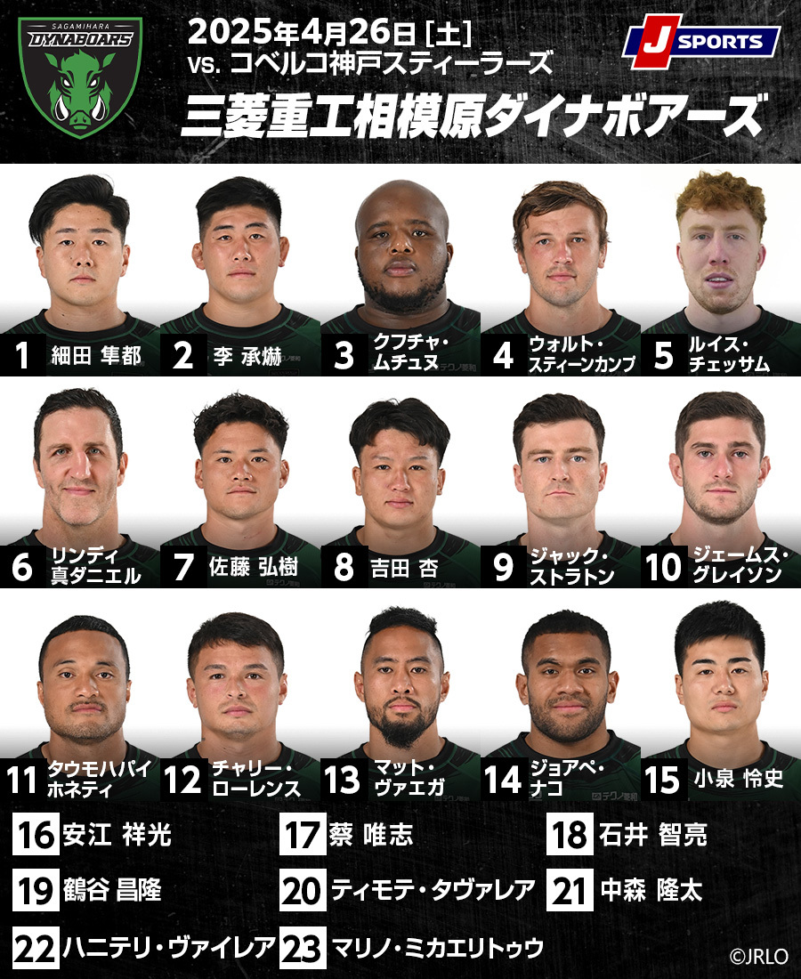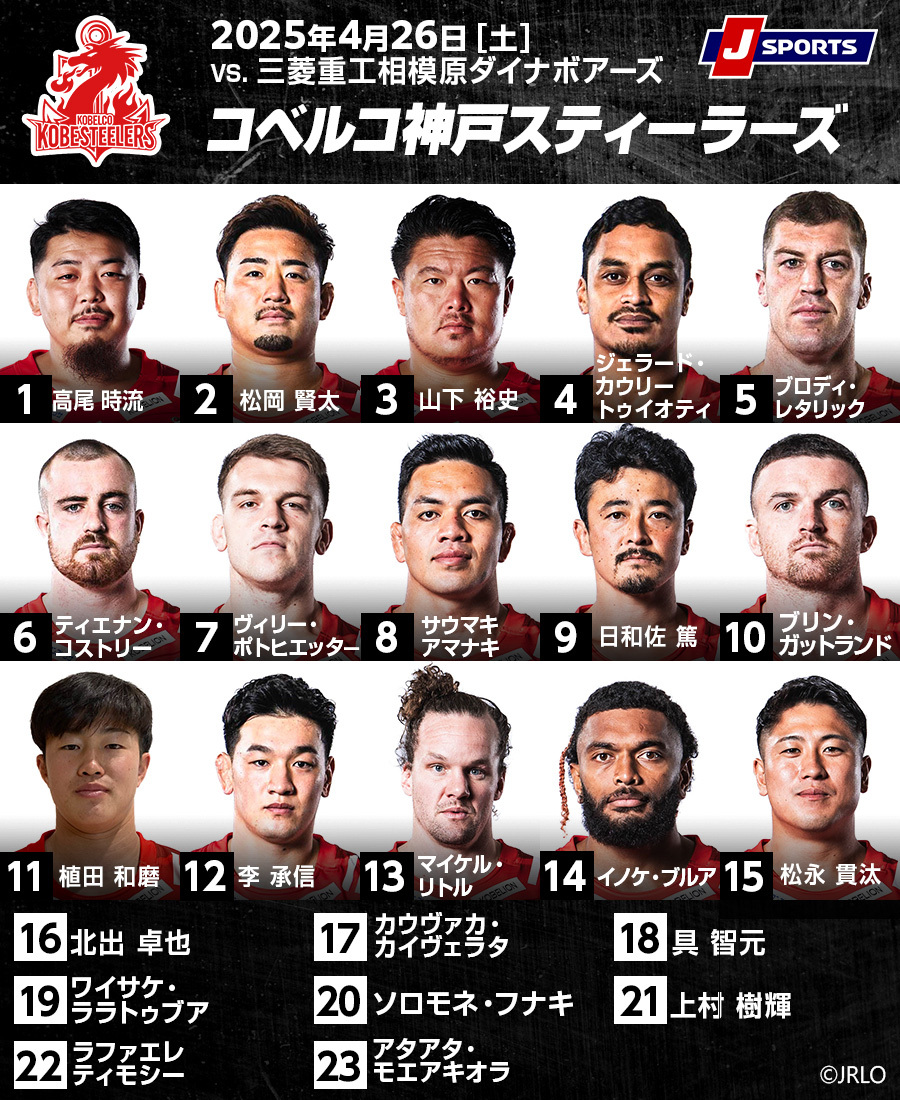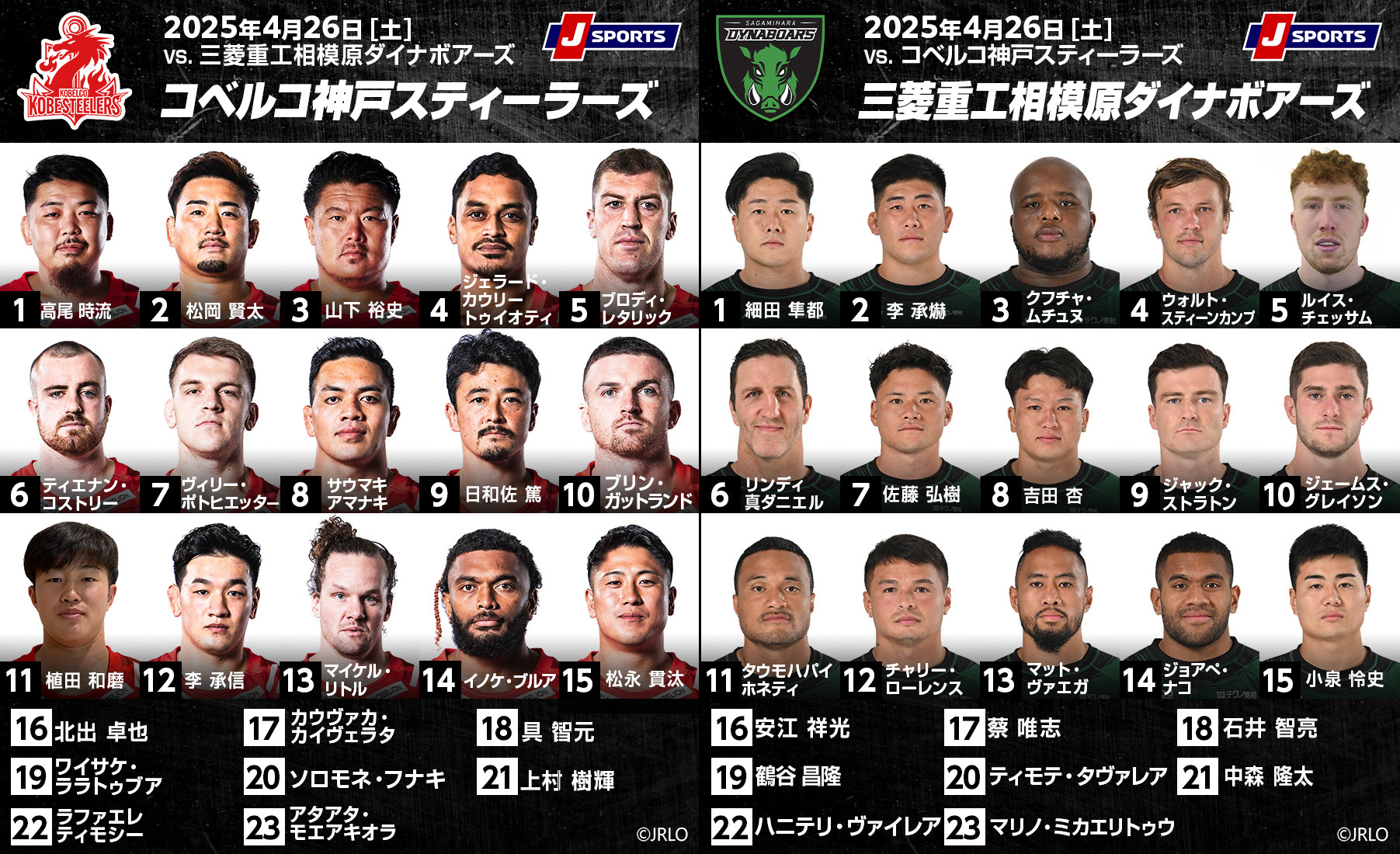 4月26日(土)に東大阪市花園ラグビー場で戦うコベルコ神戸スティーラーズと三菱重工相模原ダイナボアーズは、第15節(前節)を終えた時点で、それぞれ5位と9位。レギュラーシーズンは残すところ3試合。プレーオフ進出を懸け、必勝の思いで戦う。