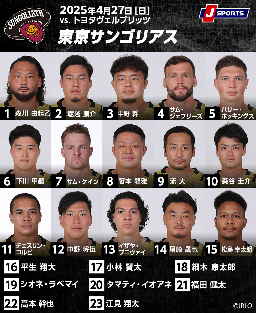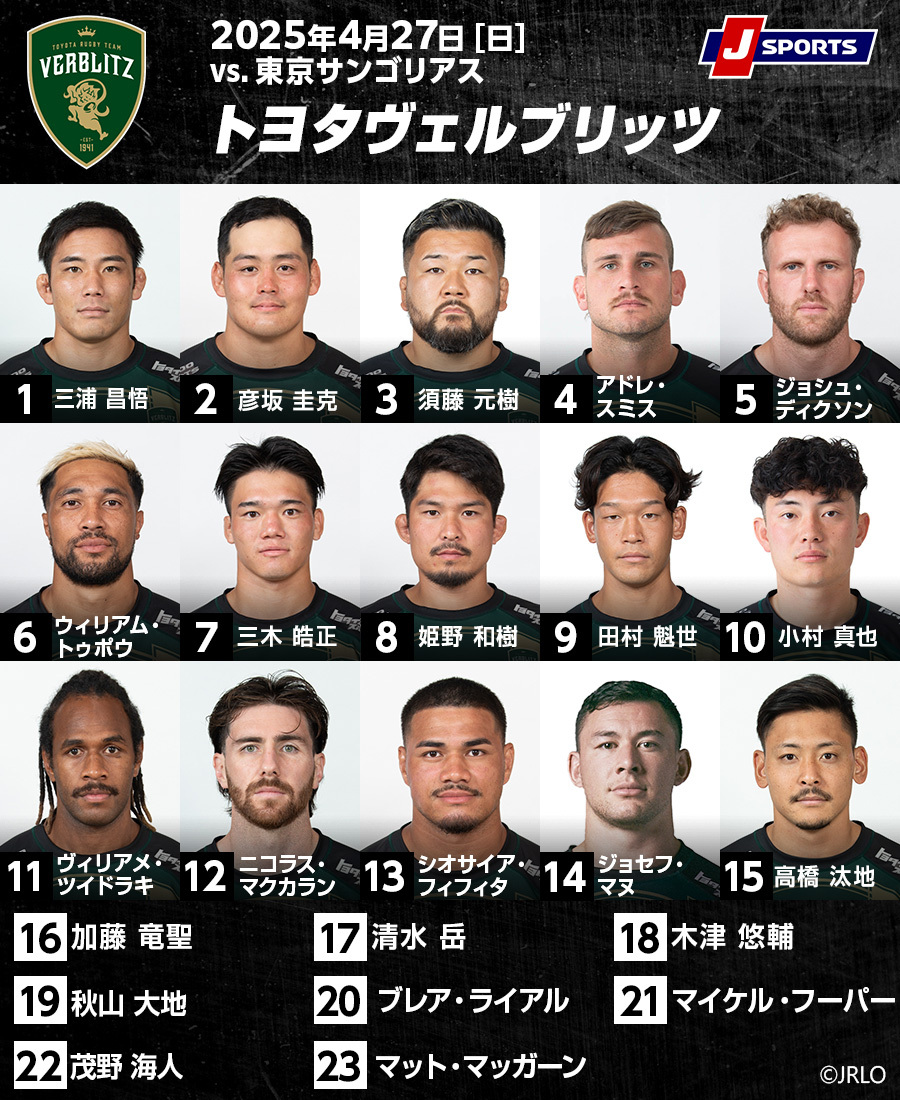 前節からの変更では、元サンゴリアスのPR須藤元樹が背番号3に入り、LOアドレ・スミス、FLウィリアム・トゥポウ、そしてルーキーFL三木皓正がスタメン復帰。バックスではCTBニコラス・マクカランに加え、注目は初出場を先発で飾るSH田村魁世(桐蔭学園-同志社大)。重要な一戦でのゲームメイクに期待が掛かる。