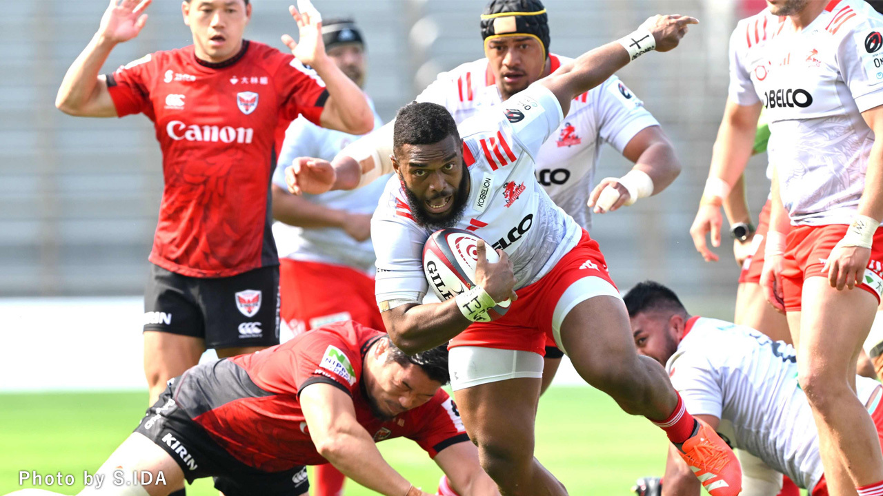 その後もトライ量産のために攻める横浜Eだが、神戸Sのディフェンスを崩し切ることができない。一方、神戸SはSOブリン・ガットランドのトライで、7―5と逆転すると、21分には、ガットランドが自陣から相手陣深くロングキックを蹴り込み、ここで得たラインアウトからの攻撃で横浜Eから移籍のWTBイノケ・ブルアがトライ。14-5となる。横浜Eも28分、SH荒井康植がラックサイドを抜け出してトライラインに迫り、松井が左中間にトライ。SO田村がゴールを決めて、14-12と差を詰める。