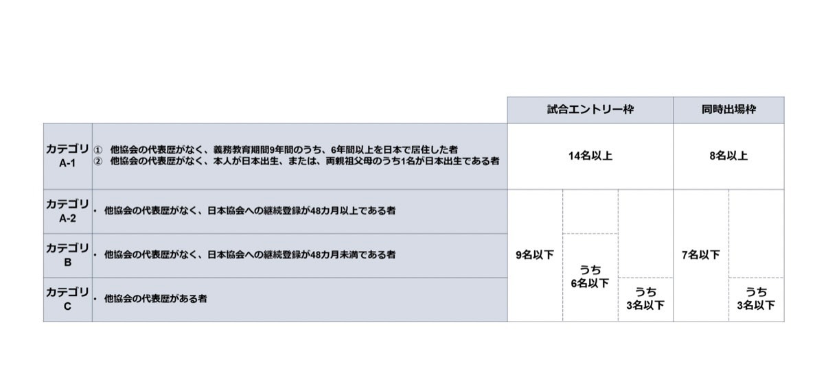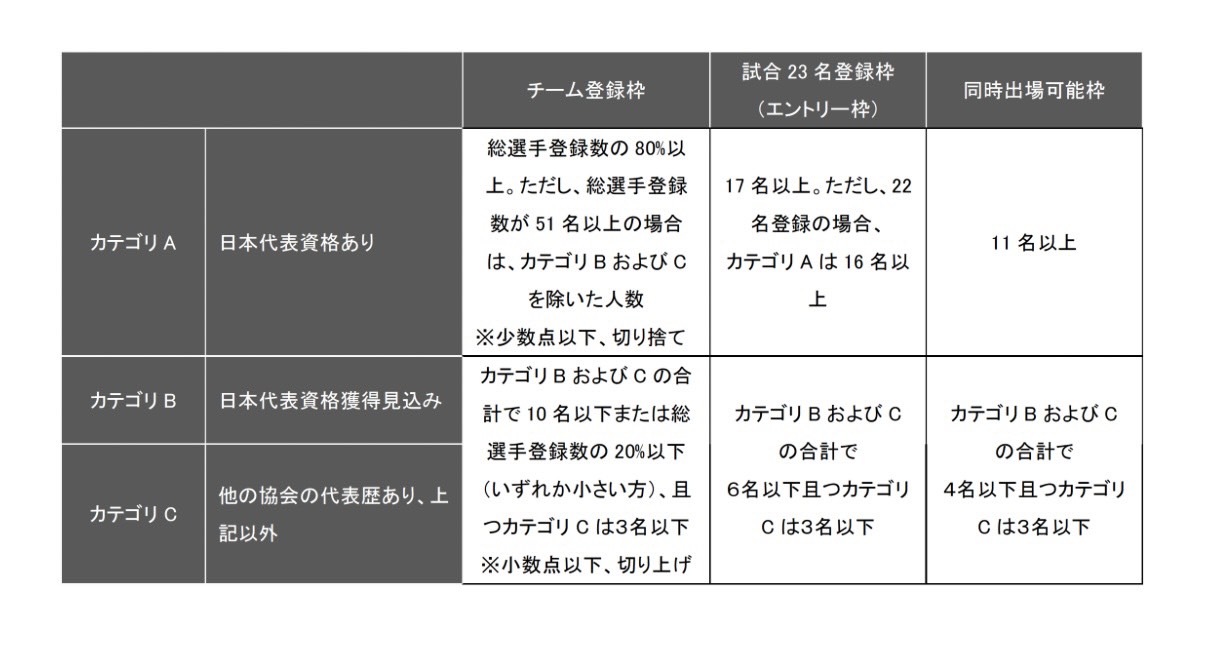 ・カテゴリA-1:小中学校の義務教育9年間のうち、6年以上を日本で過ごした選手。試合における登録数は(23名中)14名以上、同時出場数を8名以上