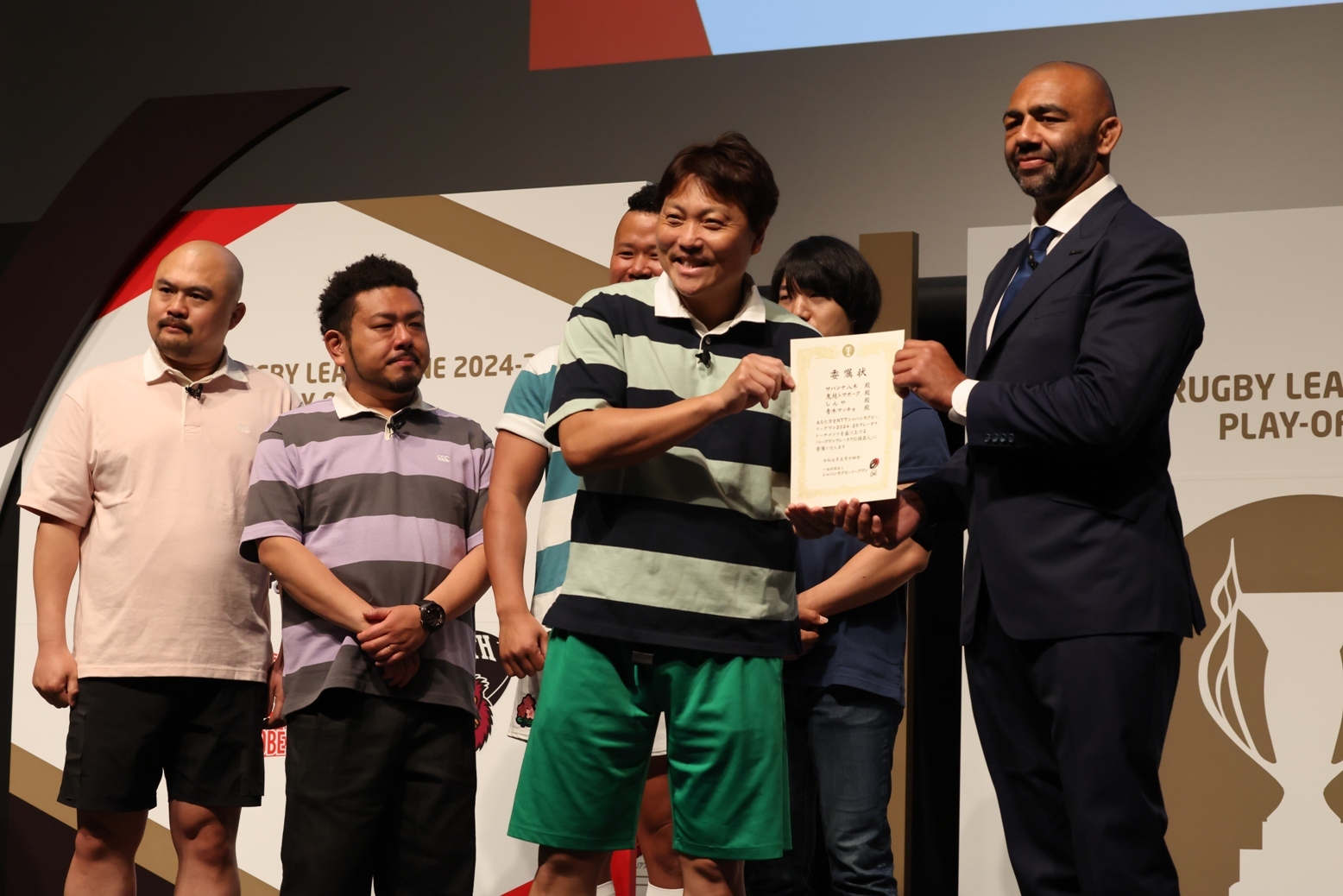 八木さんが代表として、リーチ選手から『プレーオフ応援芸人』の『委嘱状』を受け取った。
