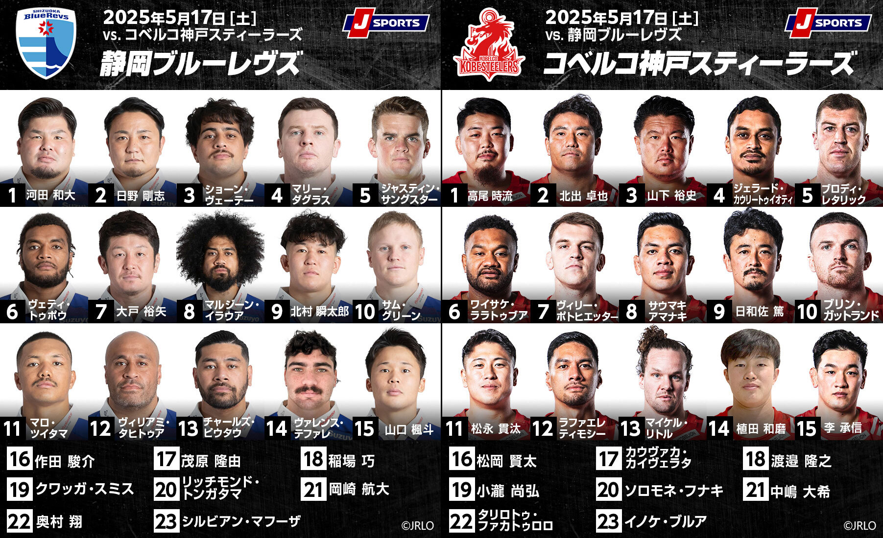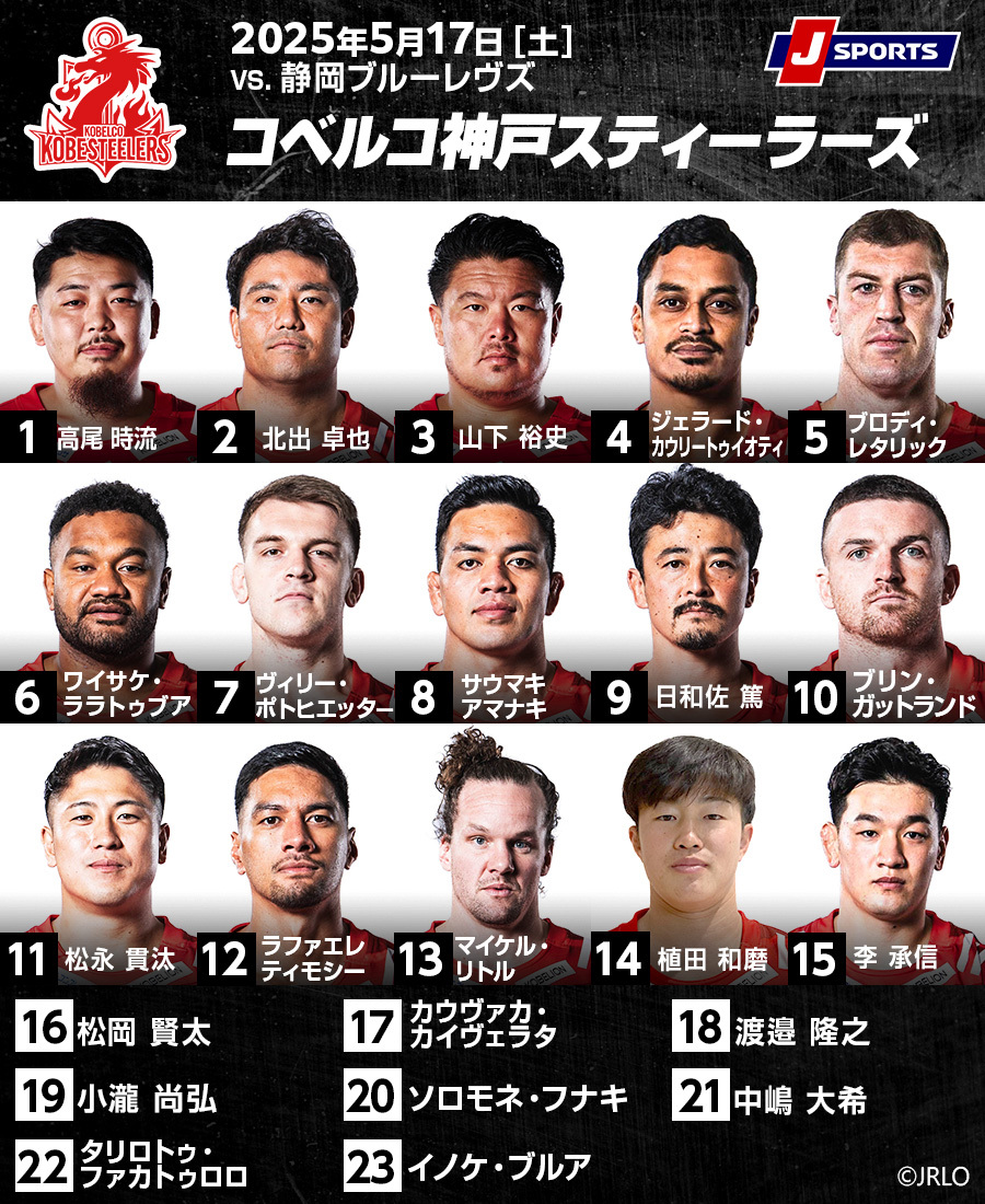 対する神戸Sは、前節負傷交代のFLティエナン・コストリーが欠場し、6番には前節4番のワイサケ・ララトゥブアが下がる。4番には、前節5番のLOでキャプテンを代行したジェラード・カウリートゥイオティが入り、5番はLOブロディー・レタリックが先発してキャプテンを務める。FL(7番)ヴィリー・ポトヒエッター、NO8サウマキ・アマナキ、SH日和佐篤、CTB(13番)マイケル・リトル、FB李承信も先発復帰。コストリーの欠場は痛いが、多くの主力が戻ったのは心強い。