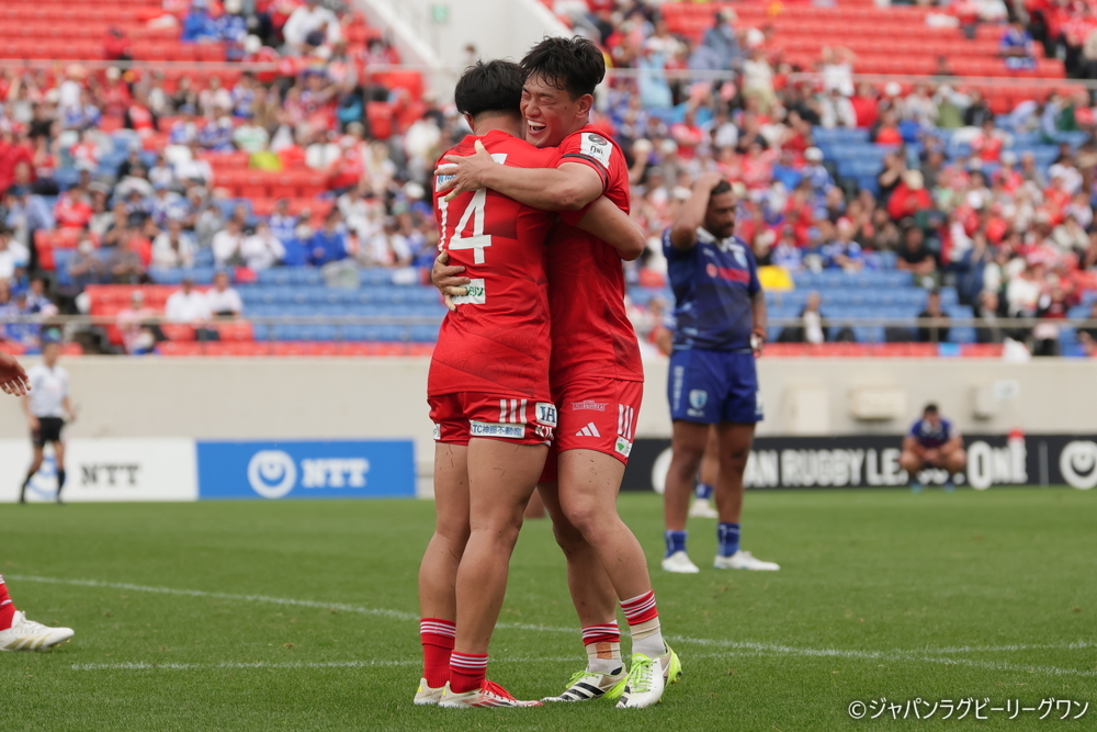 前半18分、神戸SのWTB松永貫汰が左コーナーに飛び込もうとしたところで、テファレがハイタックルを犯し、イエローカード、ペナルティートライとなる。これで10-7と神戸Sが逆転。その後も神戸Sがアグレッシブに攻め、受けに回った静岡BRが反則を繰り返す展開が続いた。前半27分、モールを押し込んだ神戸Sがトライエリアに入ったが、ここはボールを押さえることができず、トライラインドロップアウトになる。しかし、このキックを受けての攻撃から神戸SはWTB植田和磨がディフェンスを突破してトライラインに迫り、最後はFLワイサケ・ララトゥブアがトライ。17-7と突き放した。前半30分を過ぎて、ようやく静岡BRが流れをつかみ、38分、サム・グリーンがPGを決めて、17-10となって前半が終了する。