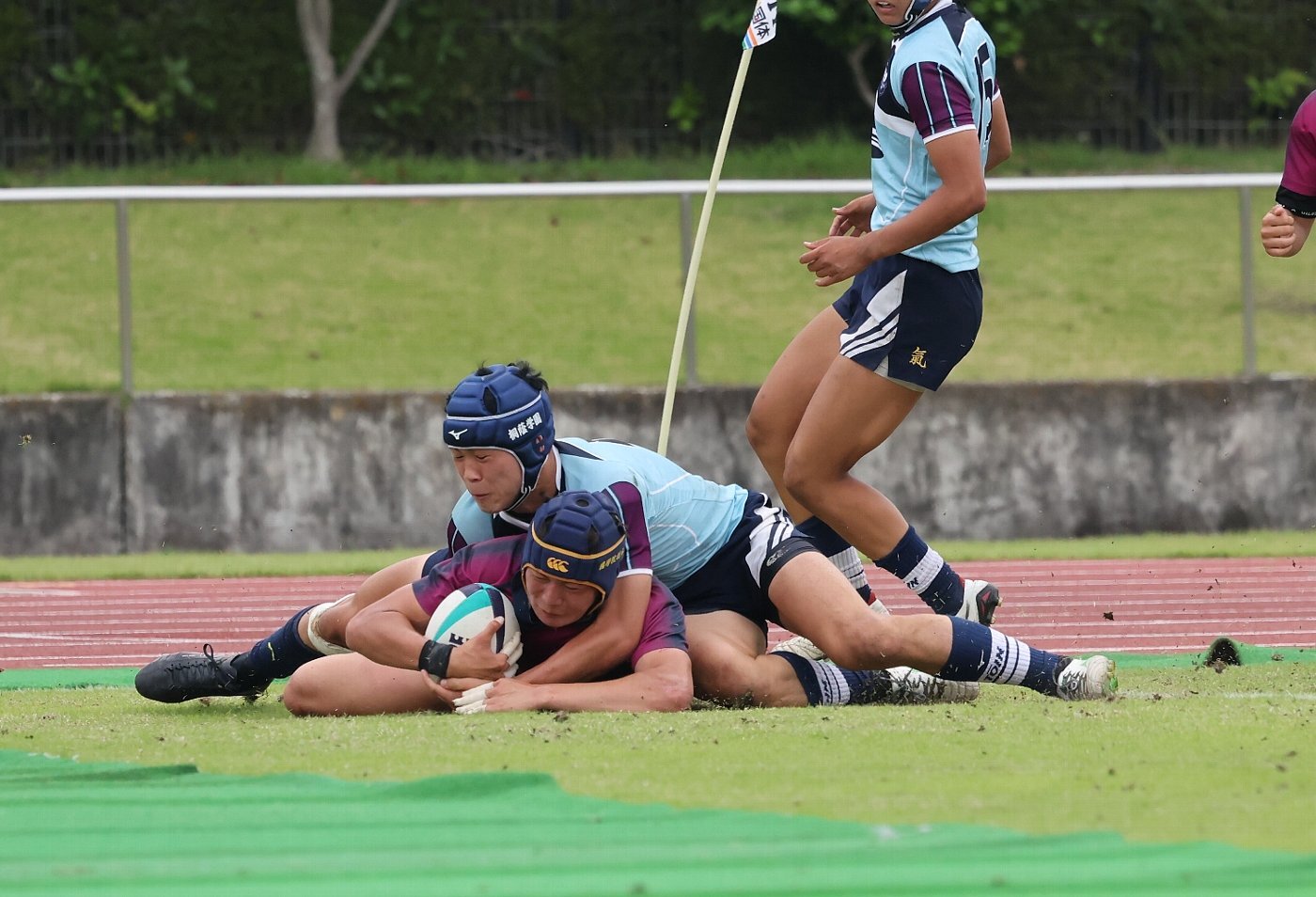 桐蔭学園も24分、相手ゴール前のラインアウトのチャンスでモールを押し込み、最後はFWが近場を攻め続けて、NO8(ナンバーエイト)足立佳樹(3年)が左中間にねじ込んでトライ。SO(スタンドオフ)竹山史人がゴールを決めて、7点を返した。