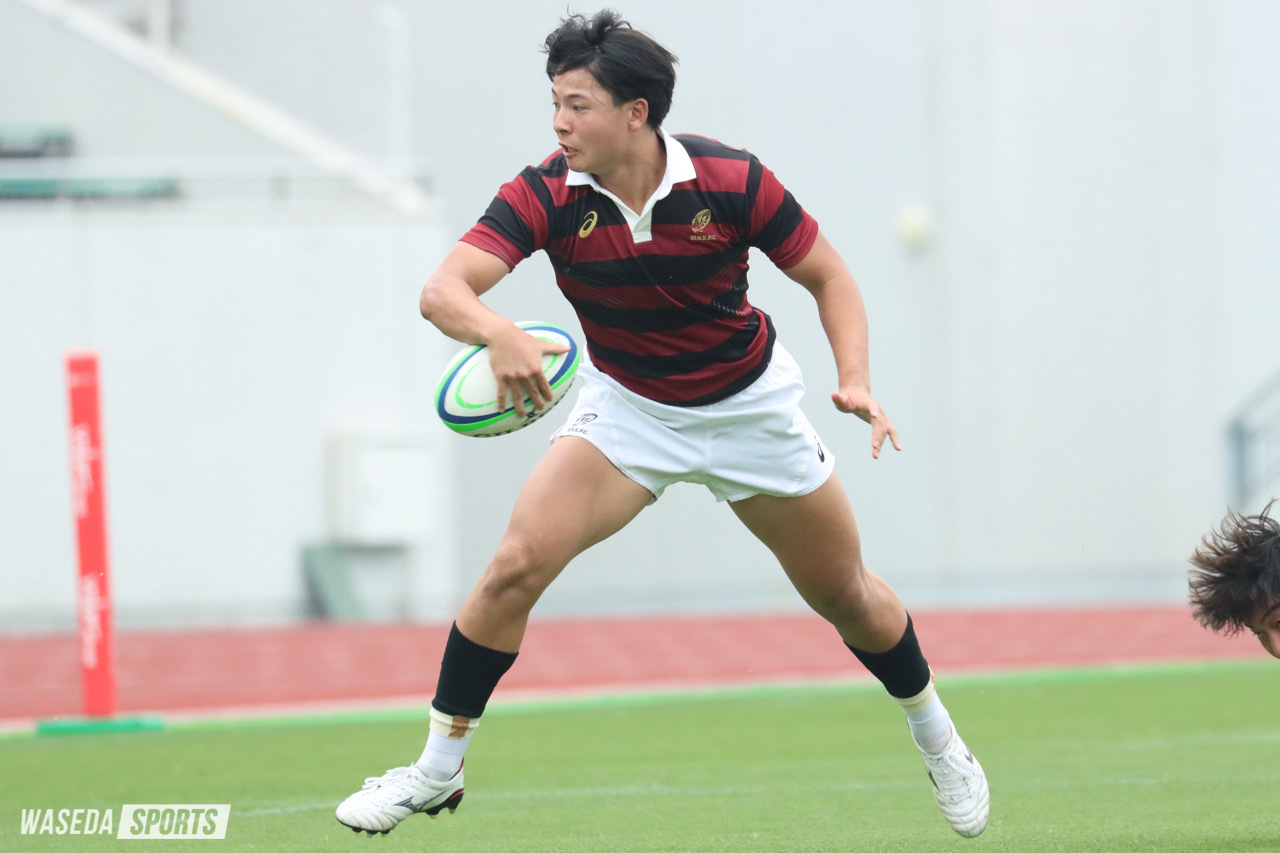 SO(スタンドオフ)田中大斗(教2=東京・早実)のキックで、敵陣まで攻め込むとラインアウトから大外まで展開し、WTB(ウィング)池本晴人(社3=東京・早実)がラインブレイク。