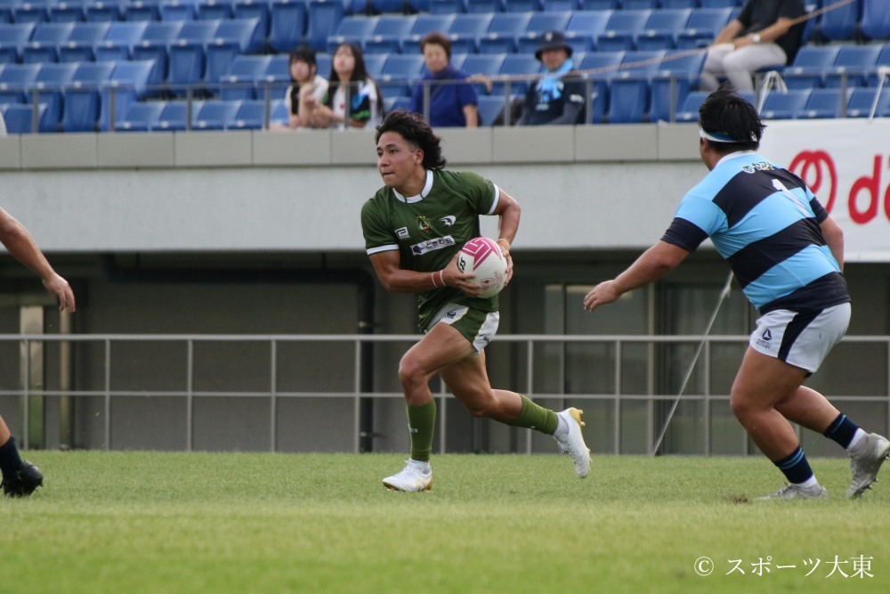 試合は大東大のSO(スタンドオフ)飯塚祐真(スポ科2=深谷)のキックオフから始まった。立ち上がりは、キックオフ後のカウンターアタックから敵陣に入り続け、安定した試合展開に。