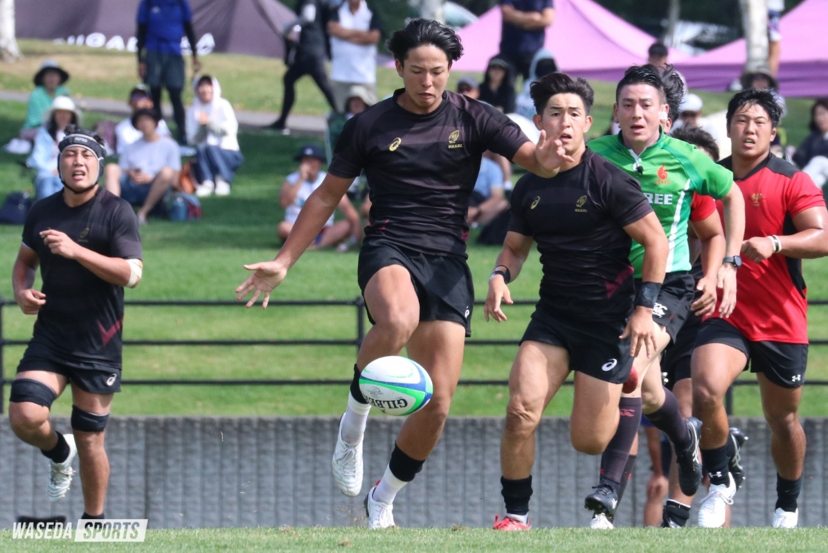 FW(フォワード)の力強い縦へのプレーと、BK(バックス)陣の巧みな横への展開力が機能し、FB(フルバック)植木太一(人2=神奈川・関東学院六浦)、CTB(センター)福島秀法(スポ4=福岡・修猷館)、WTB(ウィング)池本晴人(社3=東京・早実)らが立て続けにトライを奪う。38-0と圧倒的なスコアで、早大が前半を掌握した。