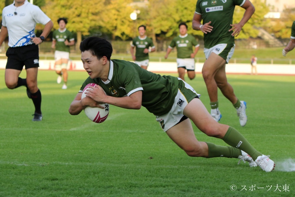 大東大の攻撃は続き、WTB大方維織(経営2=青森山田)が、得意のステップでラインブレイク。オフロードパスを繋ぎ、NO8トファエオノからリターンパスをもらったWTB大方がインゴールに飛び込んだ。