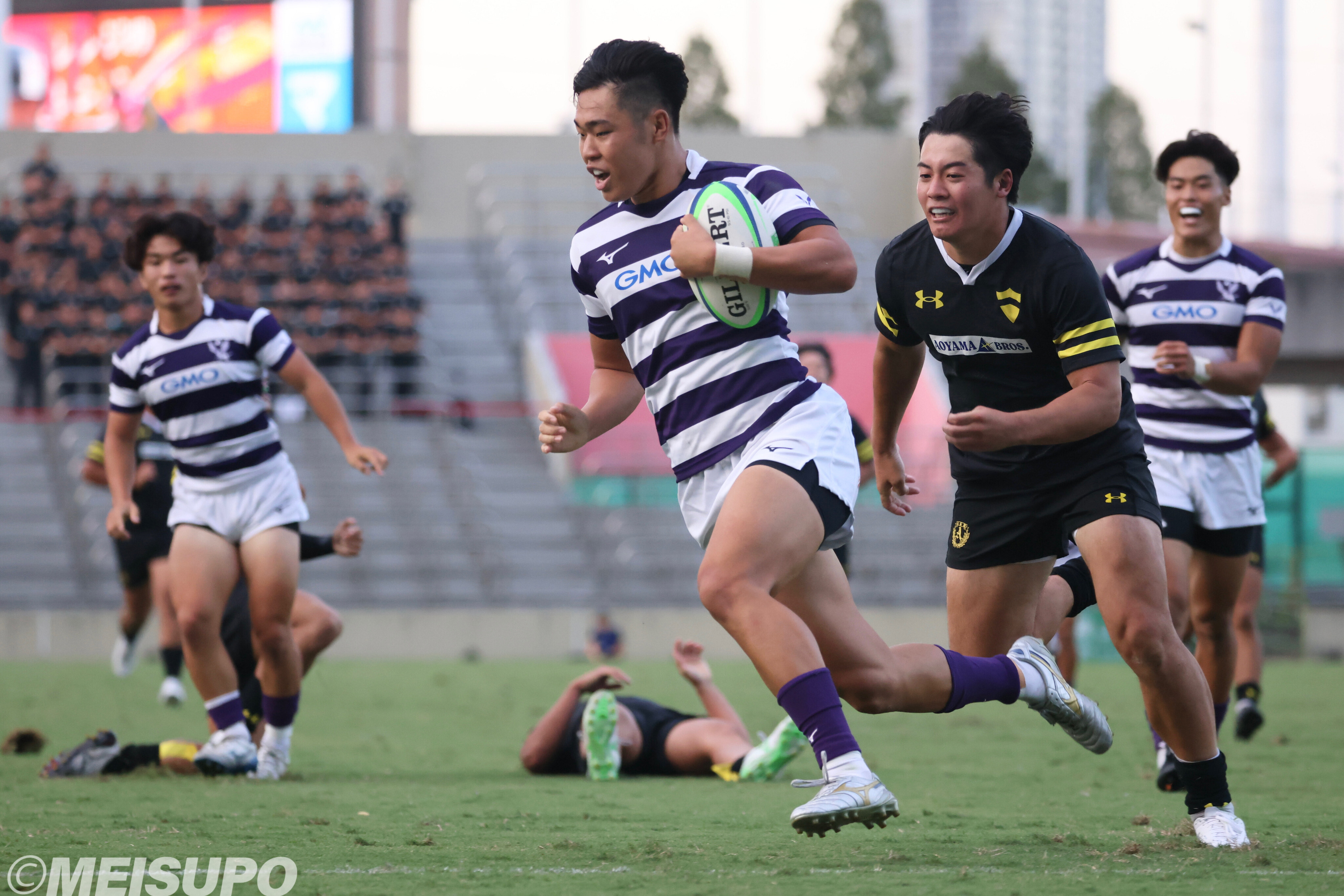 9月27日(土)、秩父宮ラグビー場で明治大学vs.青山学院大学戦が行われた。試合は青学大が序盤に流れをつかむも、前半中盤には明大が主導権を奪い反撃を開始、勢いを緩めることなく攻撃を続け、明大が今季の関東大学対抗戦で初勝利を挙げた。