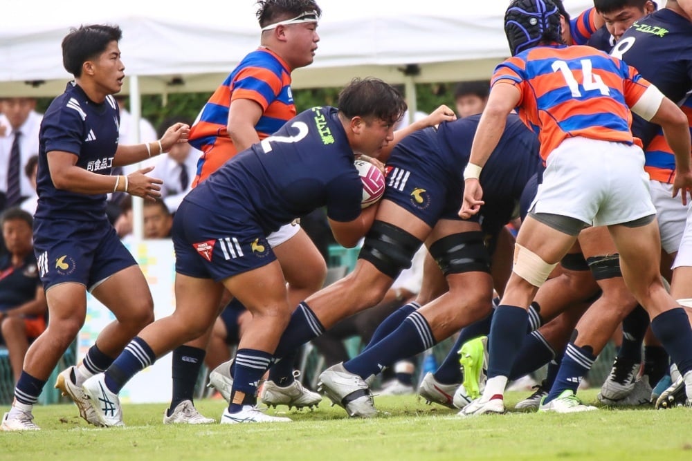 試合は開始早々に動いた。1分、WTB(ウィング)中山二千翔(2年)がラインブレイクから独走し、ノーホイッスルトライを決める。幸先よく先制したが、再開後にノックフォワードによるペナルティで自陣へ攻められると、ディフェンスに隙が生まれトライを献上。試合は振り出しに戻った。