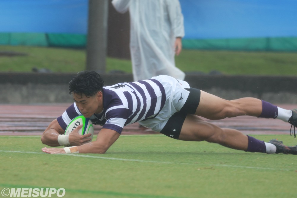 その後、NO8(ナンバーエイト)藤井達哉(政経3=東福岡)がパスを受け取り大きくゲインし、ゴール目前まで前進。フェーズを重ね、最後は左WTB(ウイング)阿部煌生(政経2=流経大柏)が先制トライを奪う。