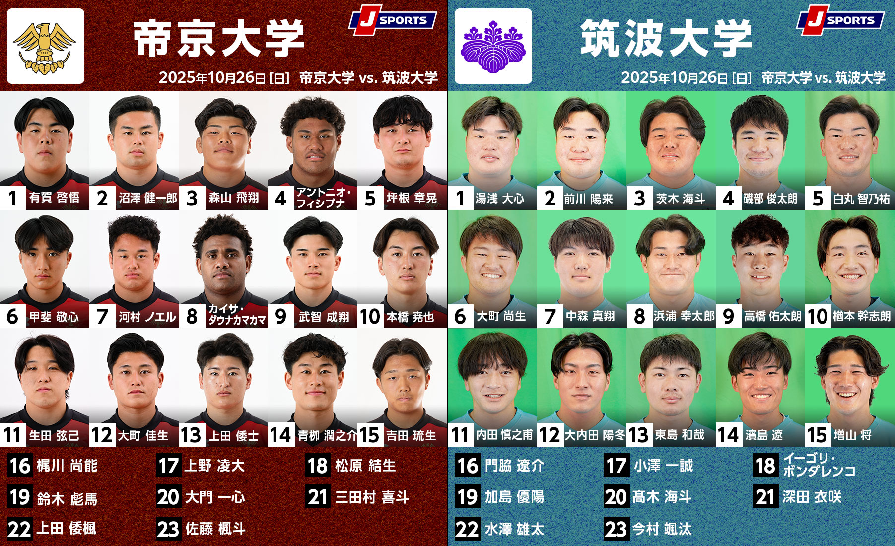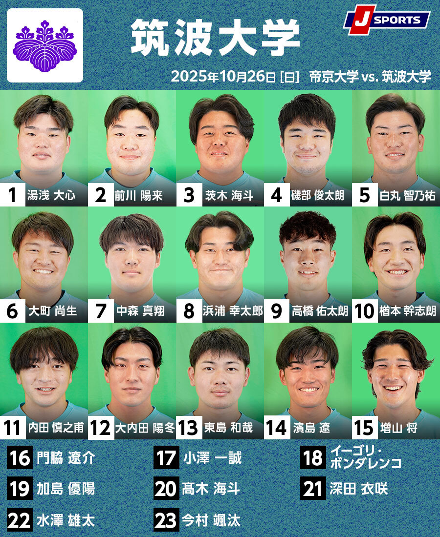 筑波大の今季のスローガンは「Rock You」。自分・仲間・応援してくれる人々を揺さぶり、熱狂させるという意味がある。キャプテンのSH高橋佑太朗(4年)、SO楢本幹志朗(4年)を軸にボールを素早く動かし、スピードのあるFB増山将(3年)、1年生WTB内田慎之甫を走らせたい。明大戦でプレーヤー・オブ・ザ・マッチに輝いたFL中森真翔(2年)の空中戦の強さ、走力も帝京大を苦しめるだろう。帝京大戦では1番のPR湯浅大心(4年)が2試合ぶりの復帰。ここまで3戦連続で先発していたFL茨木颯(4年)が欠場し、代わって166cmの小さなNO8大町尚生(4年)がFLにまわり、NO8には本来HOの浜浦幸太郎(2年)が入る。大町は帝京大のCTB大町佳生キャプテンの一歳上の兄で、浪人の末合格しており、4年生同士の兄弟対決となる。