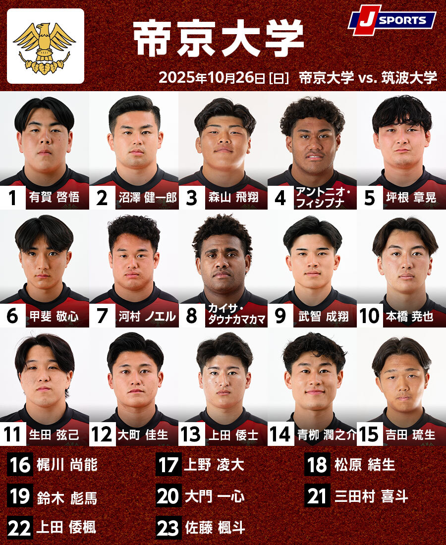 受けて立つ帝京大は大学選手権4連覇中で分厚い選手層を誇る。強いセットプレーを持つFW、速いBKのバランスもいい。SO本橋尭也(3年)の正確なキックもディフェンスを崩す大きな武器だ。筑波大戦は、10月12日の青山学院大戦から先発で4名の変更がある。1番のPRは1年生の有賀啓悟が初先発。4番のLOだった坪根章晃(2年)が5番に動き、4番には6番だったアントニオ・フィジプナ(1年)が入る。NO8の甲斐敬心(3年)が6番に回って、NO8には今季初となるカイサ・ダイナカマナカ(3年)が出場する。力強いボールキャリーと激しいタックルでFWをけん引するだろう。BKでは、11番に副将の生田弦己(4年)、14番に青柳潤之介(3年)と決定力あるWTBが先発する。FBは吉田琉生(1年)が4戦連続の先発出場だ。