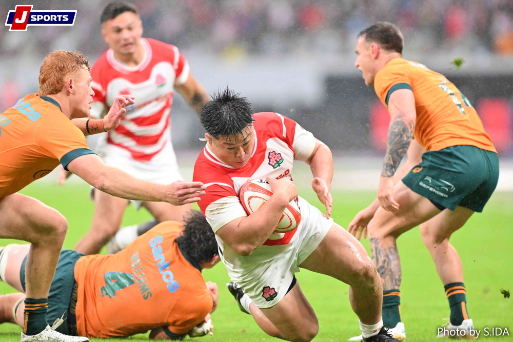 前半はこのスコアのまま終わったが、HO江良颯は両チーム最多の17タックルを決めるなどオーストラリアの攻撃を寸断するタックル、スティールを決め続け、NO8に入ったリーチ マイケルが9回のボールキャリーで攻撃の軸になった。後半、先にトライしたのは日本代表だった。12分、スクラムで相手の反則を誘い、PKからのタッチキックでトライライン直前のラインアウトを得る。ここからのサインプレーで、リーチ、キャプテンのLOワーナー・ディアンズがトライラインに迫り、最後はSH藤原忍のパスにPR竹内柊平が走り込んでトライ。竹内の背後にはローレンスとリーチがいて、ディフェンスをかく乱していた。李のゴールは決まらず、スコアは14-8となる。