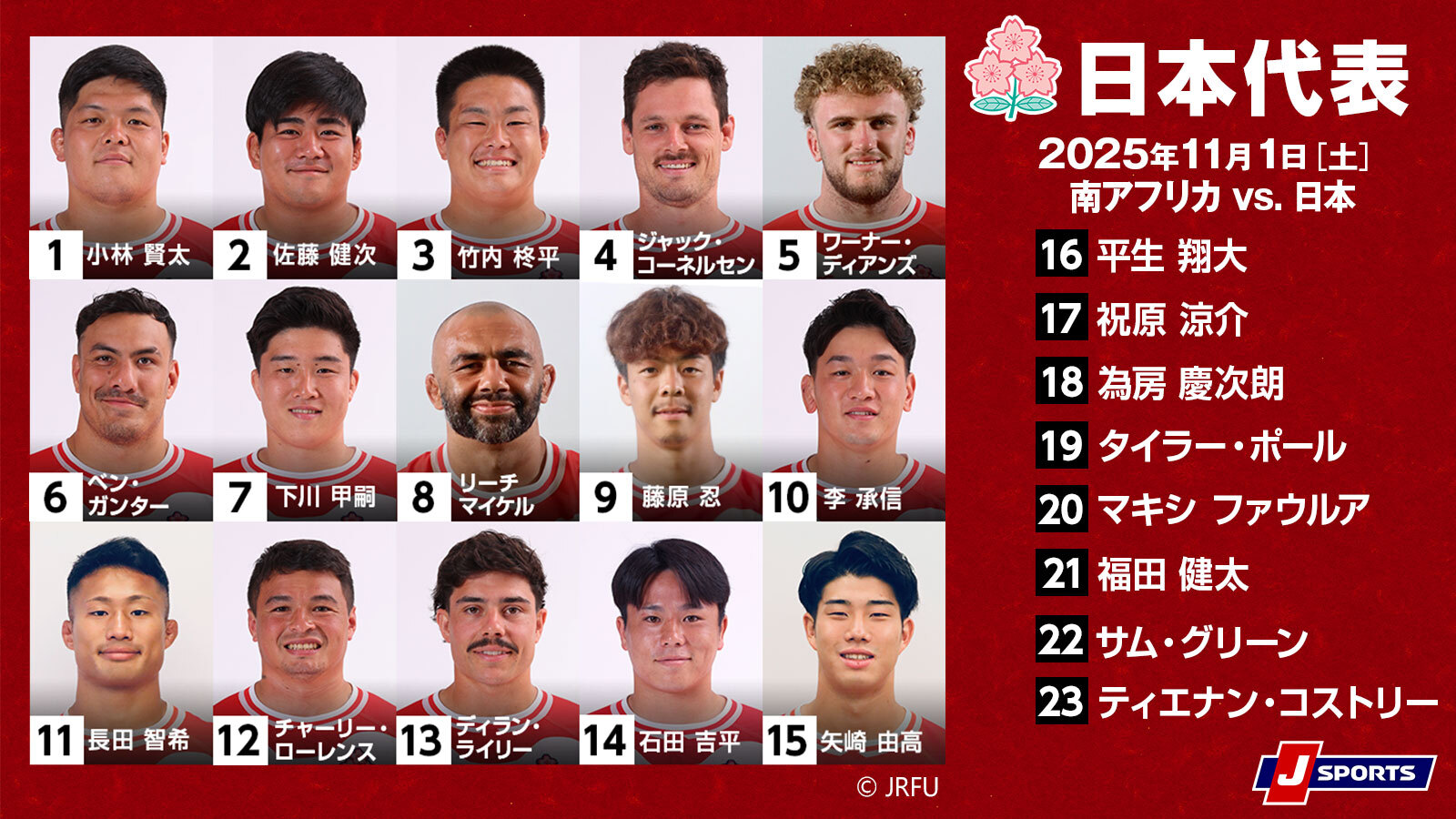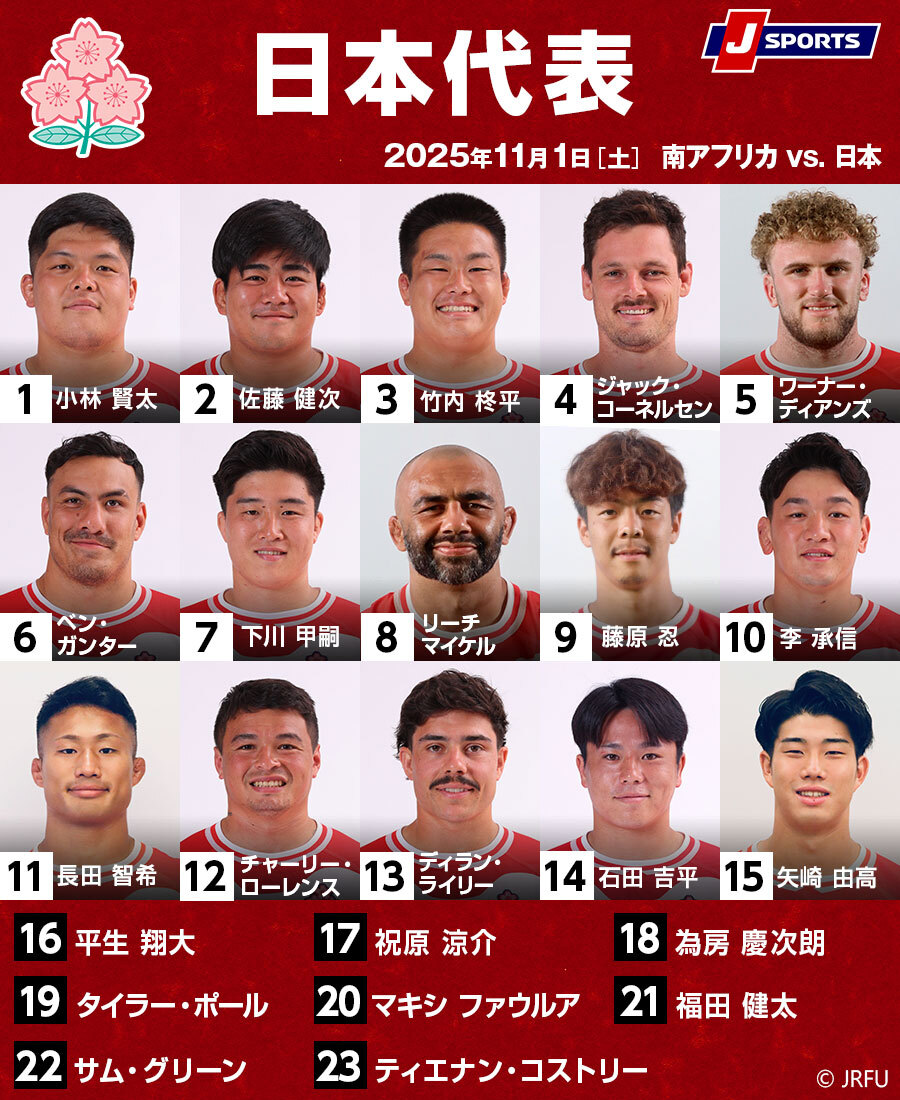 発表されたメンバーは10月25日のオーストラリア代表戦の23名のメンバーから2名の変更のみ。HO江良颯、CTB中野将伍が負傷で離脱したため、リザーブからHO佐藤健次、CTBチャーリー・ローレンスが先発に上がり、リザーブにはHO平生翔大、NO8マキシ ファウルアが入った。東京サントリーサンゴリアスの平生翔大は23歳。出場すれば初キャップ獲得となる。