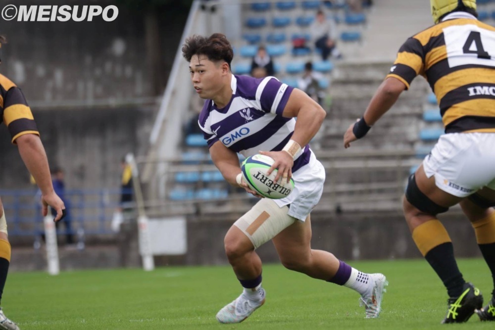 32分、前節の立教大学戦から左CTB(センター)に入っている伊藤龍之介(商3=国学院栃木)が仕掛けて生まれたスペースに、右CTB平翔太主将(商4=東福岡)が走り込み勝ち越しのトライ。「12番というポジションでやってきてコネクションが取れてきた。アタックは特に心配なくできる」(伊藤龍)。