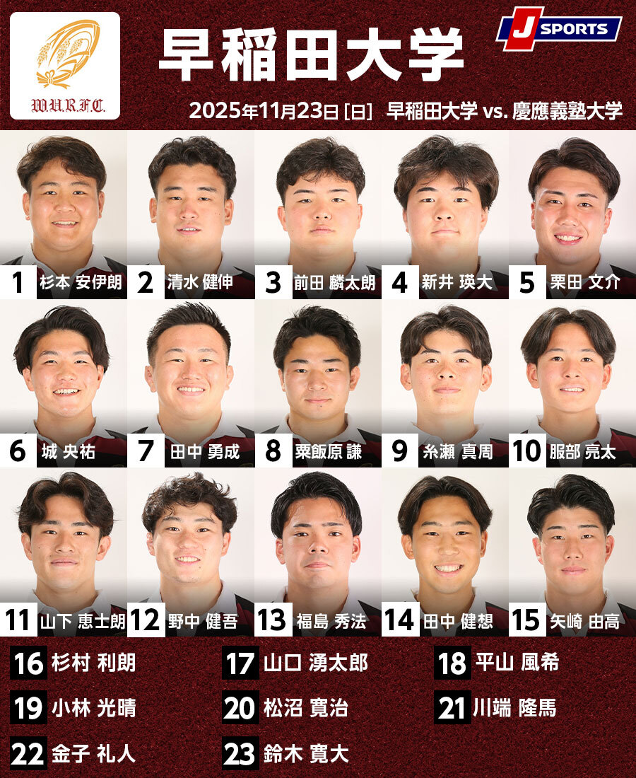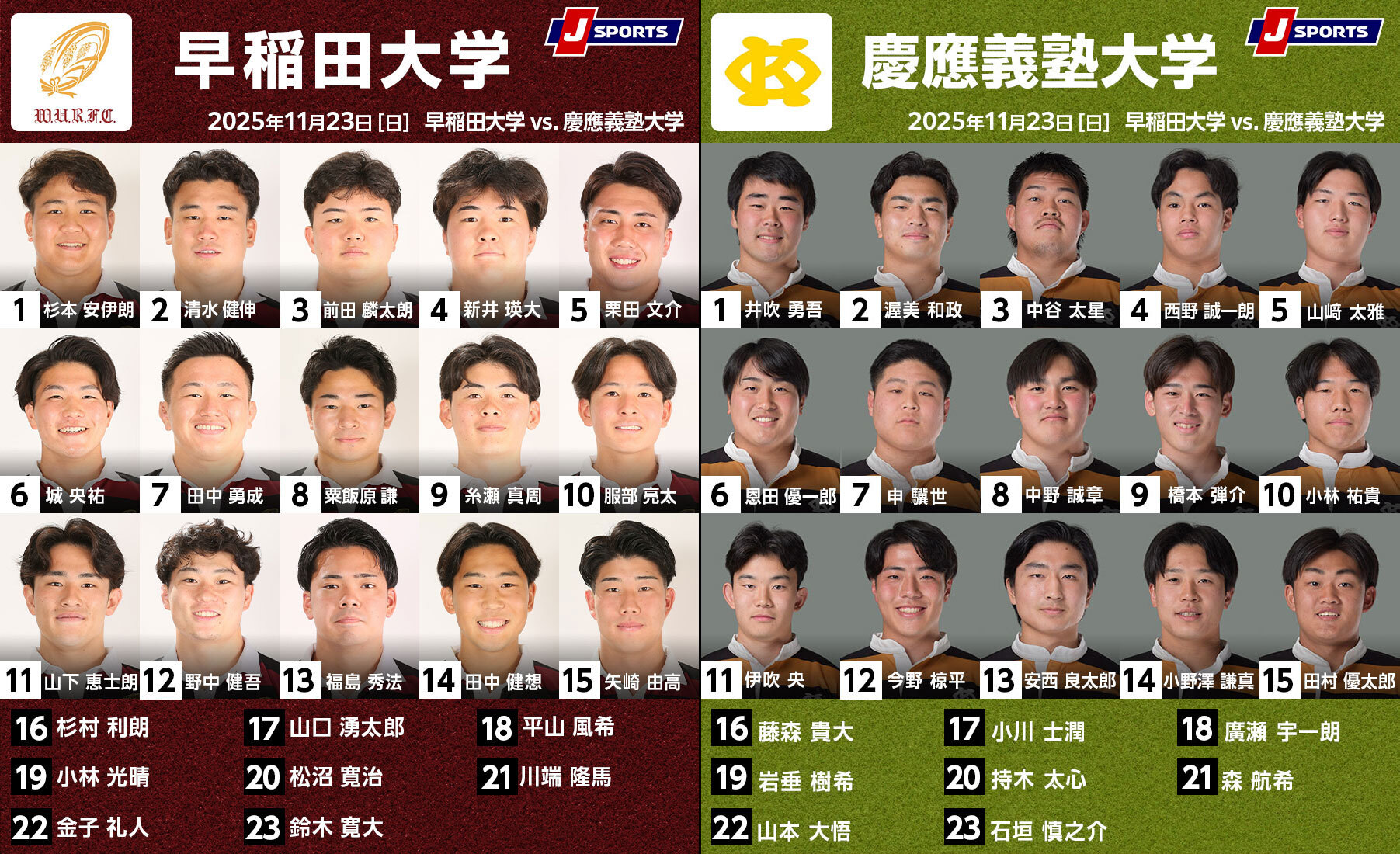 明大は早明戦に勝てば1位。帝京大は11月30日の慶大戦に勝てば最大33点になり、あとは他チームの結果待ちとなる。筑波大も連勝して勝ち点を最大限獲得すれば34点になるので、1位になる可能性がある。早大は残り2試合に連勝すれば1位になるが、連敗すれば3位以下になる可能性があり、慶大を破って対抗戦1位で大学選手権進出への足がかりとしたい。一方、慶大は早大、帝京大戦を残しており、最大32点まで伸ばすことができる。順位争いのなかで重要な存在だ。前節の明大戦では、22-24という僅差勝負を落としたが、残り2試合でその悔しさを晴らしたい。