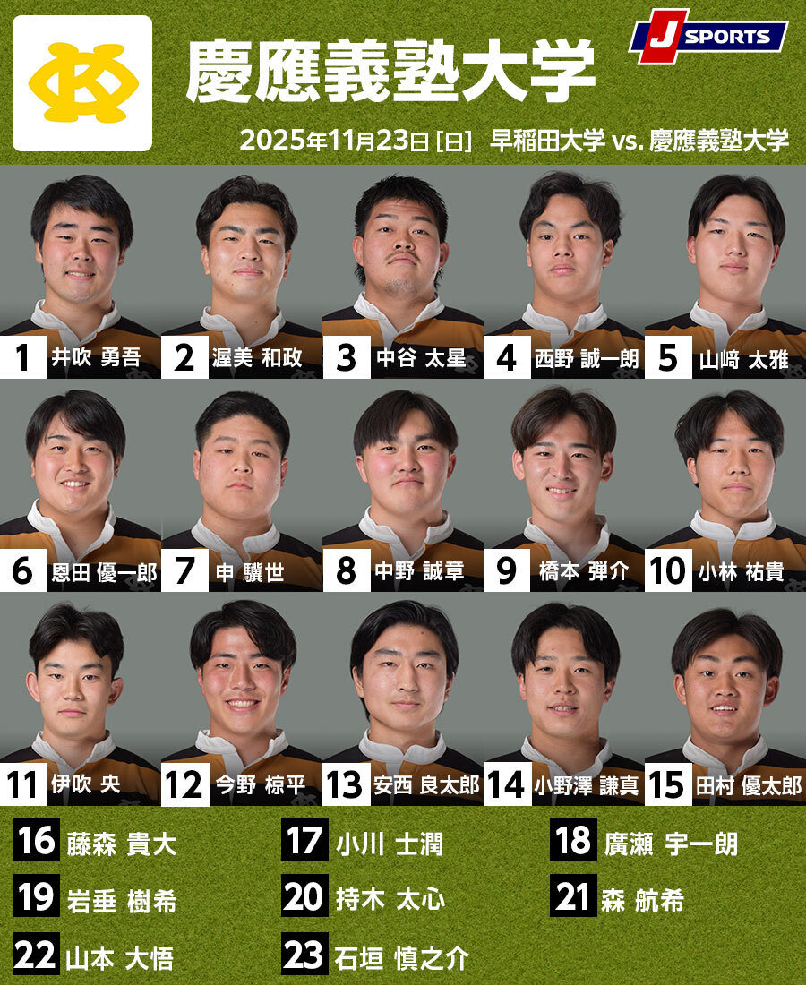 一方、慶大は明大戦から先発で3名の変更がある。HOは渥美和政(4年)が先発し、先発だった藤本貴大(3年)はリザーブへ。13番のCTBは、小舘太進(4年)に代わって1年生の安西良太郎が入り、WTBも江頭駿(4年)に代わって小野澤謙真(2年)が先発。スピードある2人がアウトサイドバックスに揃った。