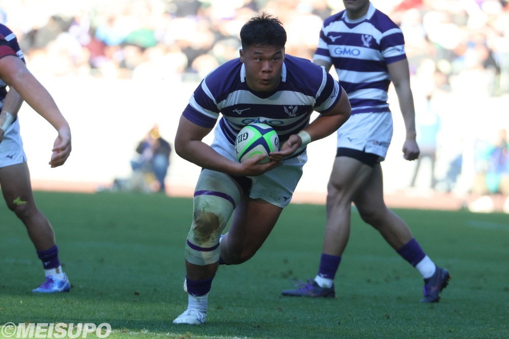 その後、古賀龍の躍動で敵陣に攻め込むと、SH(スクラムハーフ)柴田竜成(営4=秋田工)が裏へキックする。脱出しようと服部亮太(早大)が蹴ったキックを田代がチャージし、東がキープ。そのまま飛び込んでトライを決めた。