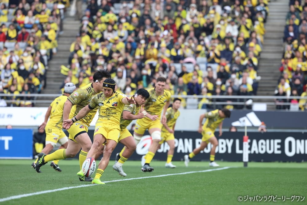 突っ込んできた相手をショートステップでいなし、なんとリーグデビュー戦のファーストタッチでリーグ初トライ。チーム全員に笑顔が弾ける一本を加えると、左隅からのコンバージョンも中村亮土が決めてリードは11点(36-25)に。