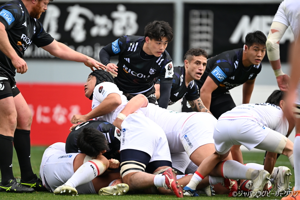 後半開始直後、坂手がハイタックルでイエローカードを受け、7分にはCTBディラン・ライリーが左手を痛めて負傷交替。相模原DBが攻勢に出るが、トライチャンスでハンドリングエラーや反則でスコアできず、逆に埼玉WKは15分、ラインアウトからのサインプレーでWTBマリカ・コロインベテがトライし、28-3と突き放す。モールで3トライをあげ、相模原DBがモールディフェンスに集中するとみるや、交替HO佐藤健次とコロインベテをからめたサインプレーであっさりとトライを奪ったのだ。埼玉WKの試合運びの上手さが際立つプレー選択だった。そして後半21分、交替出場のFL福井翔大がトライしてダメを押した。