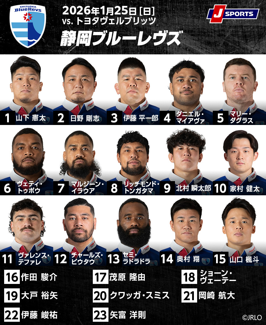 キックオフ48時間前に発表されたメンバーを見ると、静岡BRは先発15名で7名の変更がある。3番のPRは、稲葉巧から伊藤平一郎に。4番のLOは今季加入のダニエル・マイアヴァがリーグワンデビューを飾る。キャプテンのFLクワッガ・スミスは欠場し、7番のFLには前節NO8のマルジーン・イラウアが上がり、NO8ではユーティリティーFWのリッチモンド・トンガタマが先発する。ハーフ団はSH岡崎航大、SO筒口允之コンビから、SH北村瞬太郎、SO家村健太に変更。前節レッドカードを受けたCTBシルビアン・マフーザは欠場し、12番のCTBにはチャールズ・ピウタウが入り、14番のWTBは矢富洋則がリザーブに下がって、奥村翔が先発する。前節、プレーヤー・オブ・ザ・マッチに輝いたセミ・ラドラドラは今回も13番を背負って出場。その突進力、オフロードパスはトヨタVの脅威となる。
