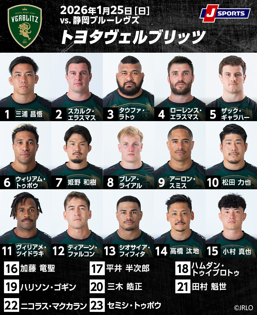 トヨタVは、先発15名では6名の変更。4番のLOは、ジョシュ・ディクソンが欠場し、前節は5番だったローレンス・エラスマスが4番に入って、5番ではザック・ギャラハーが先発。FL(6番)は青木恵斗に代わってウィリアム・トゥポウが入る。ハーフ団はSHアーロン・スミス、SO松田力也の経験豊富な2人が先発し、前節SOで先発した小村真也がFBに入る。FBだった高橋汰地はWTBへ移動。5戦連続で出場していたマーク・テレアは欠場。CTBはニコラス・マクカランとティアーン・ファルコンが先発とリザーブで入れ替わり、松田と12番のファルコンでBKラインをコントロールする。