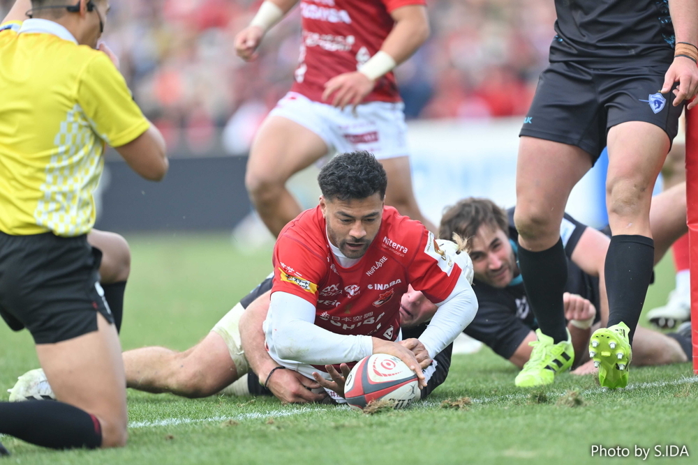 開始4分にラインアウトからフェーズを重ねられ、右サイドでWTB竹山晃暉にインゴールに入られるも(コンバージョンキックも成功)、辛抱強く攻めて2PGを決め、38分には集中力高くモールを押し切って計11得点。序盤の7得点だけのワイルドナイツを逆転した。