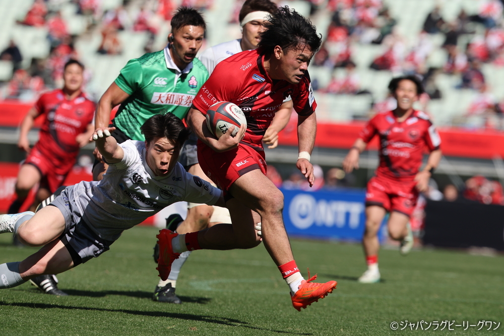 プレーヤー・オブ・ザ・マッチに選ばれたレッドハリケーンズのFB、山口のパフォーマンスは要チェックだ。ボールタッチも多く、何度もチャンスメイク。走るだけでなく、多彩なキックも盛り込んでスタンドを沸かせた。