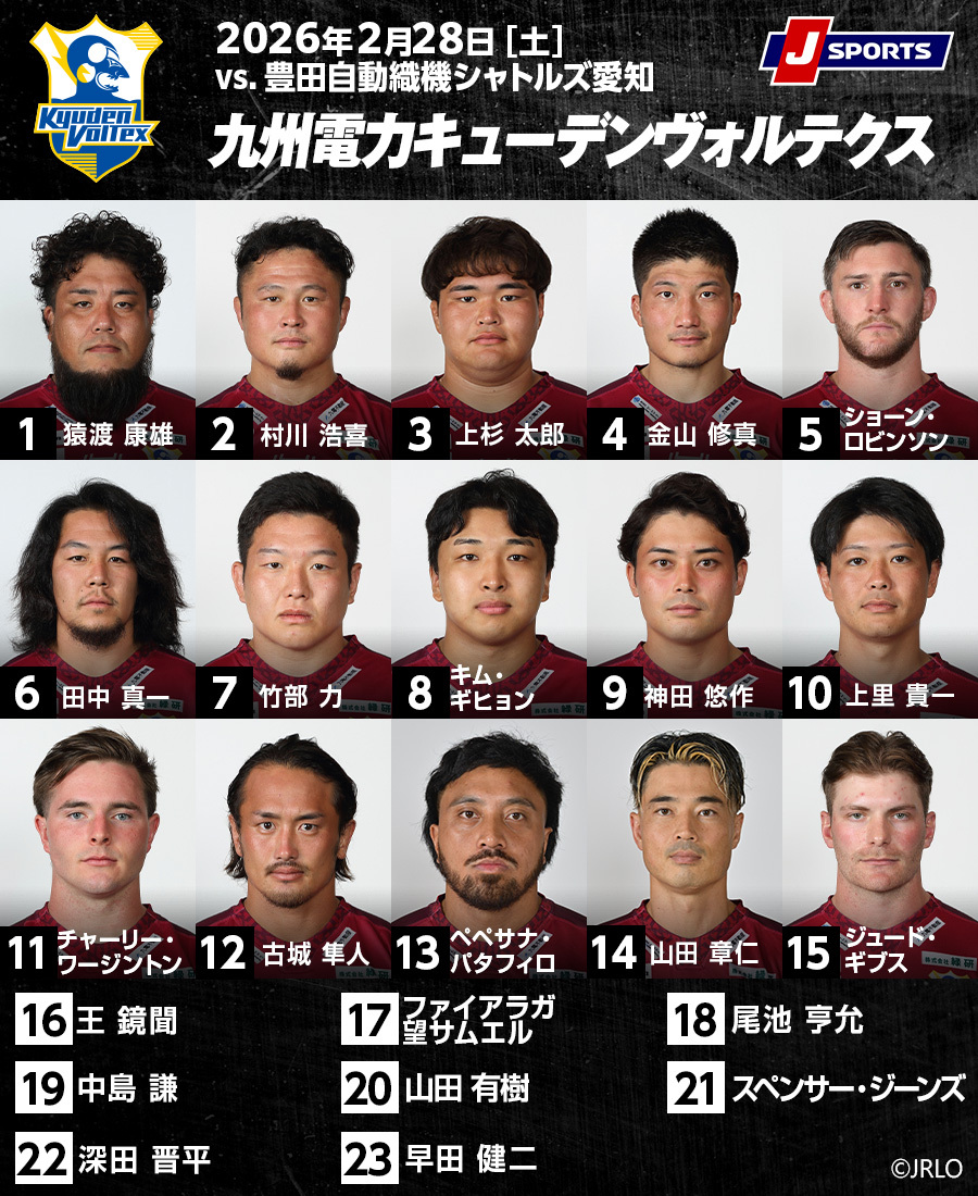 対する九州KVは、前節から先発15名で6名の変更がある。3番のPR上杉太郎、4番のLO金山修真は今季初出場。NO8はラーボニ・ウォーレンボスアヤコに代わって前節交代出場のキム・ギヒョン、SHは竹ノ内駿太から神田悠作となる。11番のWTBはチャーリー・ワージントン、13番のCTBには今季加入のペペサナ・パタフィロもメンバー入り。キャプテンはCTB(12番)古城隼人。フレッシュなメンバーでどんなチャレンジを見せてくれるか楽しみだ。