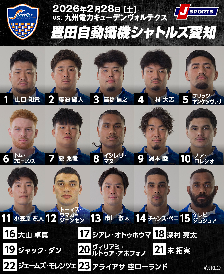 2月26日に発表された試合登録メンバーを見ると、S愛知は前節と23名とも変わらず。キャプテンのFL鄭兆毅はじめ、前節リーグ戦50試合を達成したHO藤浪輝人、突破力あるNO8イシレリ・マヌ、SOノア・ロレシオ、7トライをあげているWTBチャンス・ペニら頼もしいメンバーが並ぶ。