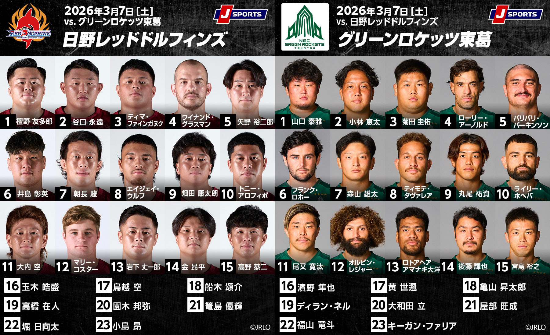 3月5日(木)に発表された試合登録メンバーを見ると、日野RDは、前節から先発15名では4人の変更がある。3番のPR船木頌介はリザーブに下がり、体重130㎏のPRティマ・ファインガヌクが第1節以来の先発。キャプテンのFL中鹿駿は欠場し、井島彰英が6番に入って、7番のFLに朝長駿が先発する。SHは篭島優輝がリザーブに回り、リザーブだった畑田康太朗が先発する。WTB福士萌起は欠場。14番だった大内空が11番に移動し、14番のWTBに金昂平が入った。リザーブに入ったPR鳥越空、CTB堀日向太は出場すればリーグワンデビュー。FL園木邦弥は今季初のメンバー入りになる。
