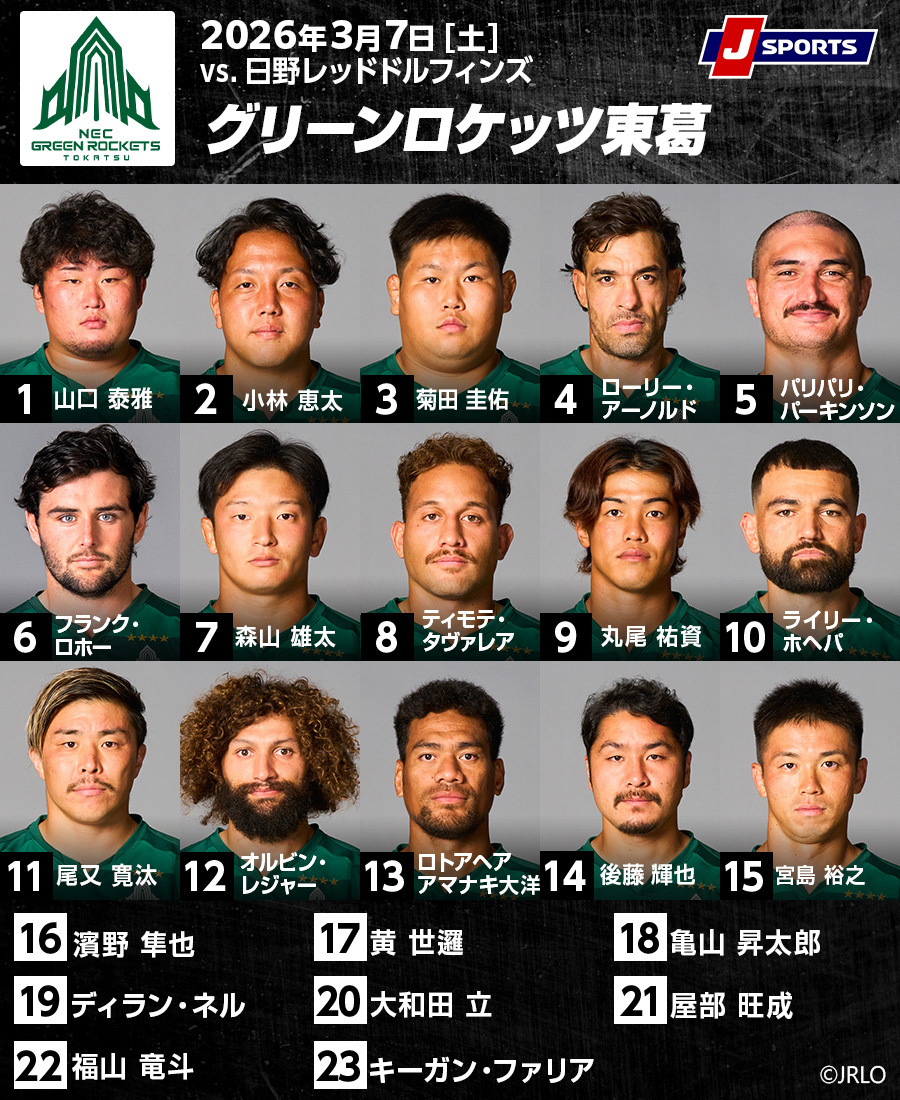 対するGR東葛も前節から先発は4名の変更。負傷退場のSOリース・マクドナルドは欠場し、ライリー・ホヘパが第4節以来の先発。HOは小林恵太がリザーブに回り、菊田圭佑がリザーブから先発へ。FBはキーガン・ファリアがリザーブに下がって今季初登場となる宮島裕之が15番を背負う。今季ディビジョン1トップのボールキャリー数を誇るNO8ディラン・ネルもリザーブに下がり、NO8には6番からティモテ・タヴァレアが移動し、6番のFLにはフランク・ロホーが入って先発する。