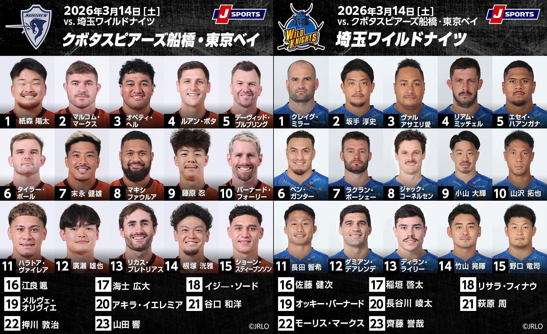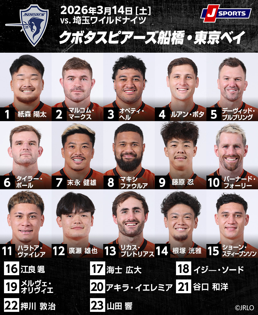 3月14日、クボタスピアーズ船橋・東京ベイが 埼玉パナソニックワイルドナイツと戦う(秩父宮ラグビー場)。両チームとも今季開幕からの10試合を終えたところで9勝1敗。勝ち点差でスピアーズが首位(勝ち点44)、ワイルドナイツが3位(勝ち点41)のポジションにいる。