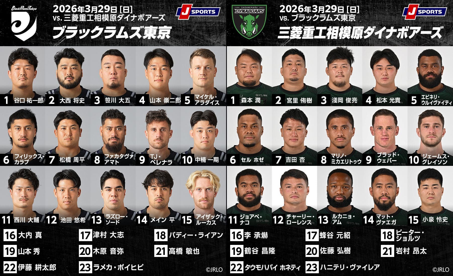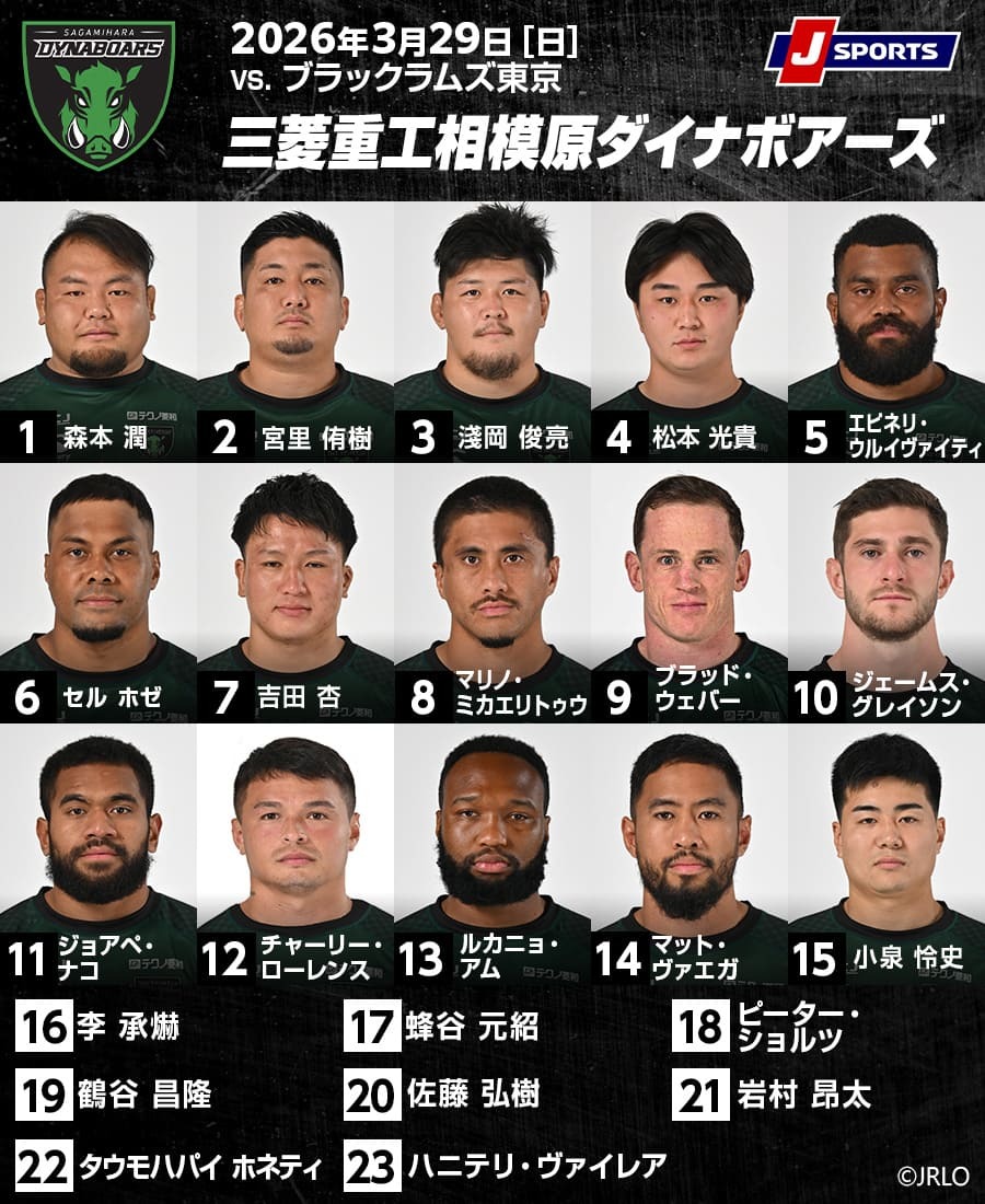 相模原DBは先発15人では、6名の変更がある。LOエピネリ・ウルイヴァイティが2週間の出場停止明けで復帰。FL(6番)ジャクソン・ヘモポが10節以来の先発となる。おの2人の復帰は攻守に前向きなり強がある。前節は6番のFLだった吉田杏は7番に動き、鶴谷昌隆はリザーブへ。ハーフ団は前節のブラッド・ウェバーが欠場し、SOチャーリー・ティトコムがリザーブ。先発はSH岩村昂太、SOジェームス・グレイソンとなる。11番のWTBはジョアペ・ナコから加島DJ、12番のCTBはチャーリー・ローレンスからハニテリ・ヴァイレアになる。