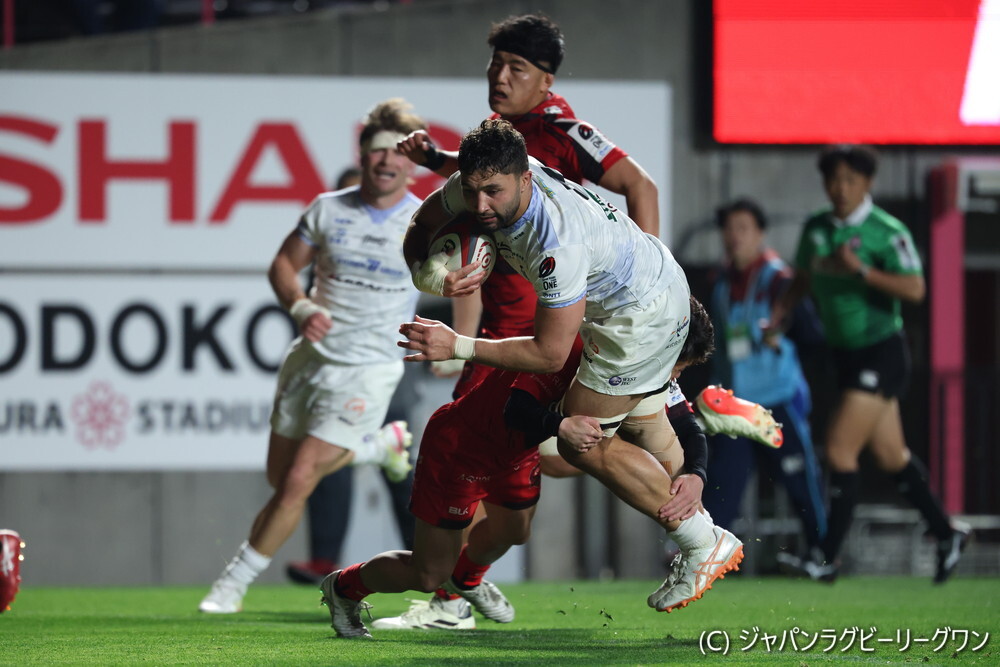 想定外の13人となった九州KVだが、接点での激しさは衰えず、2人少ない状況でもアグレッシブにボールをつなぐ。20分、WTBチャーリー・ワージントンがタックルを弾き飛ばしながら逆転トライ。24分にはHO村川浩喜がモールからトライし、ギブスがゴールを決めて、17-7とした。1本PGを返されたが、33分、村川、40分には大車輪の活躍だったFLコルビー・ファインガがトライし、31-10とリードして前半を折り返した。