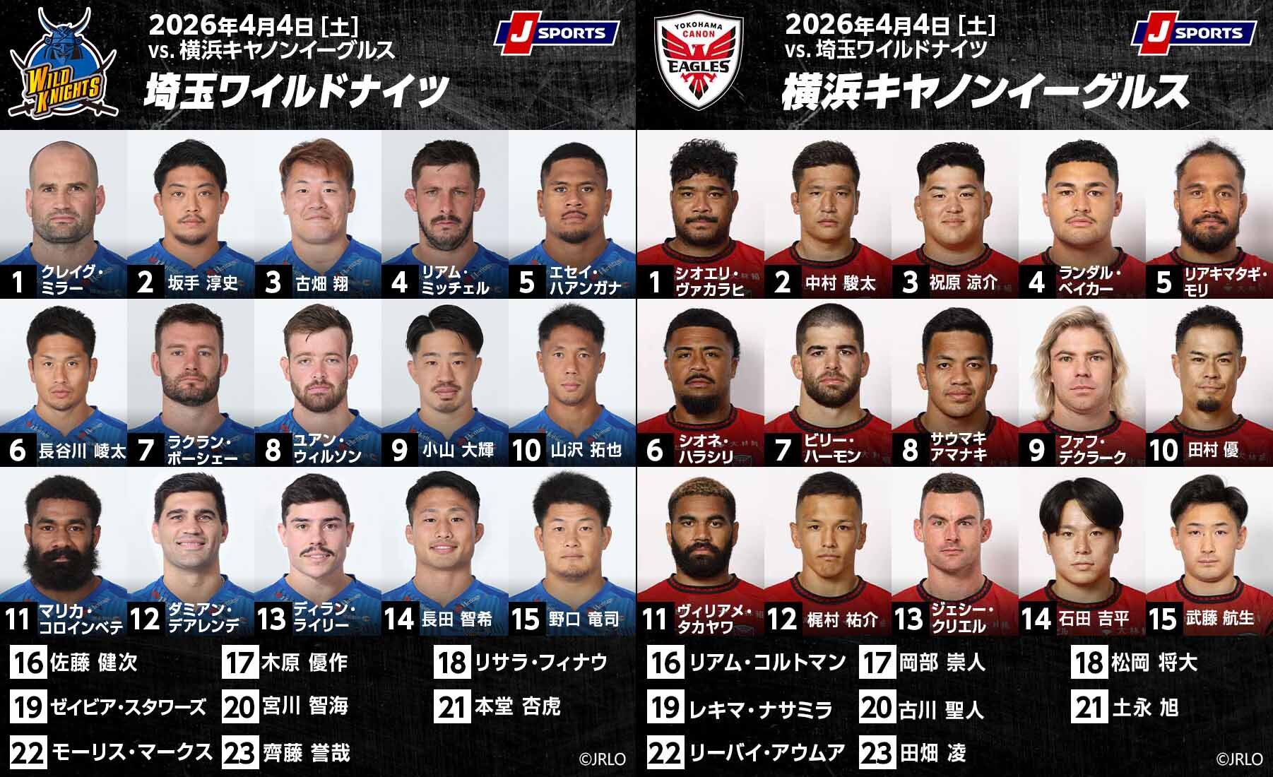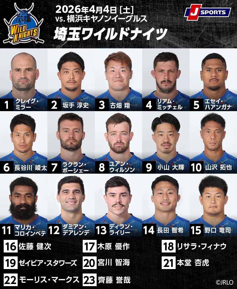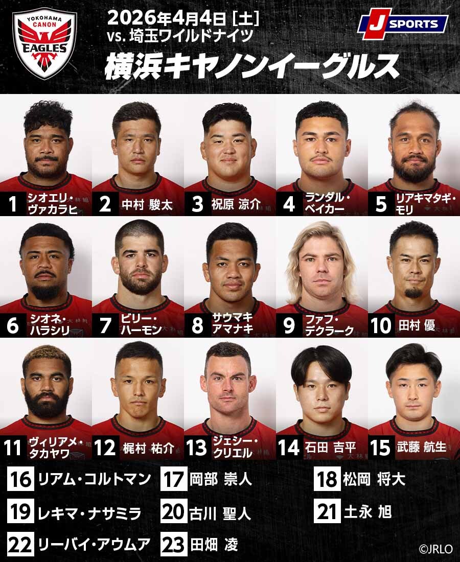 2位ワイルドナイツに挑むイーグルスの先発メンバーでは、前節からフォワード3名(PRシオエリ・ヴァカラヒ、LOランダル・ベイカー、LOリアキマタギ・モリ)とバックス3名が変更。