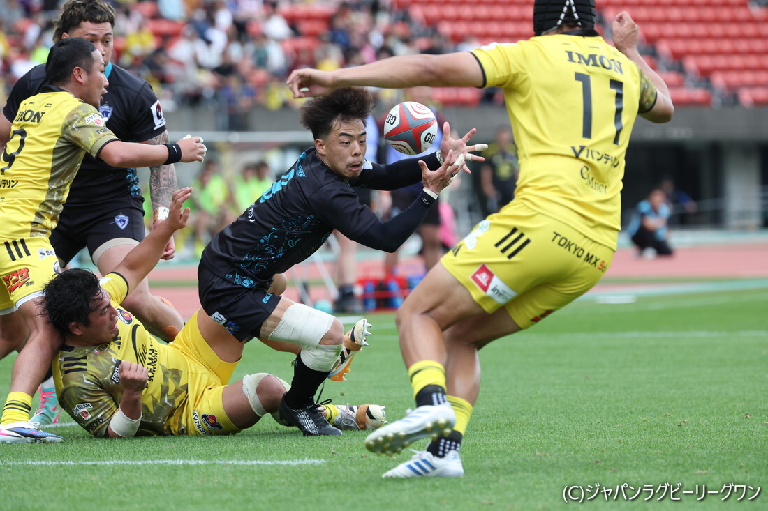 中盤での数的優位をお手本のようなラン&パスで攻略。ピッチを横幅いっぱいに駆使したアタックから、FBスティーブンソンがスワーブ。アシスト名手でもある元NZ代表がWTB木田晴斗にラストパスを送り、ついに勝ち越し。(19-24)