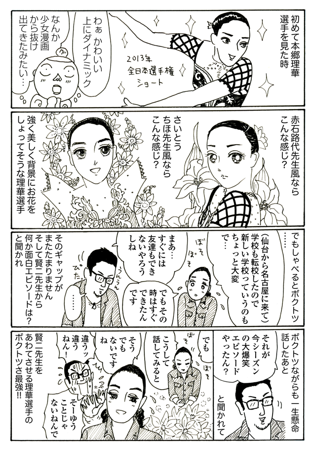 前編では珍しく緊張していた賢二先生でしたが、後編は絶妙なトークで本郷理華選手の笑顔を引き出しました。“理華ちゃんスマイル”にほっこりした方も多いのでは?
