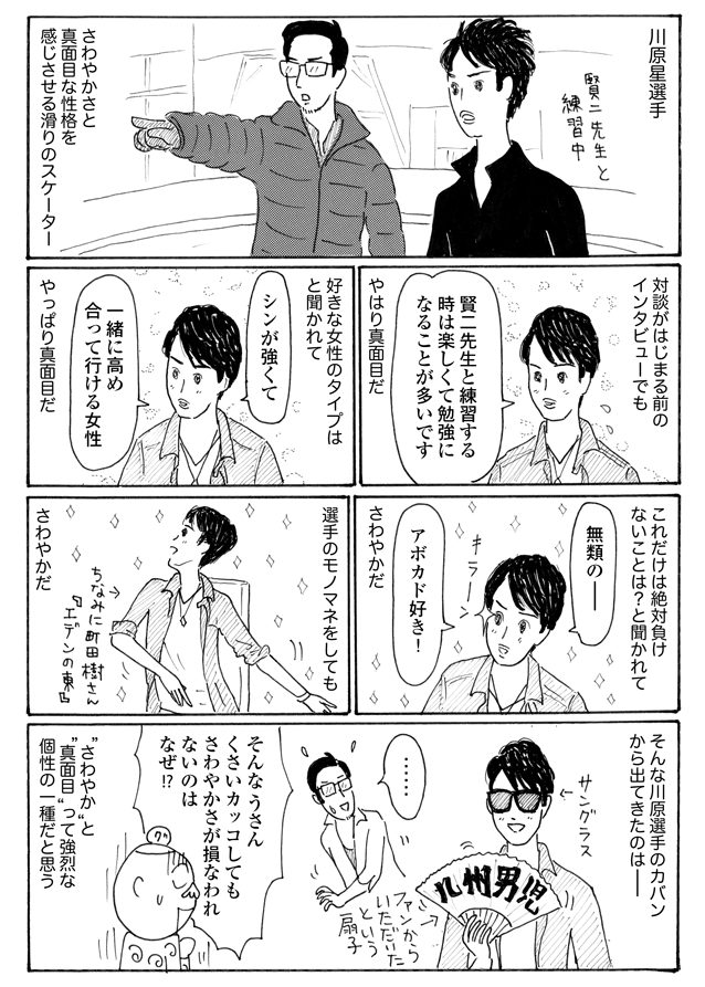 『グだくさんのグ!! ~どうでもいいこだわりに溢れた人生の断片コミックエッセイ~』『スケオタデイズ ~戦慄のフィギュア底なし沼~』にてフィギュアスケート観戦漫画が話題となった。