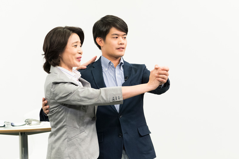東野:これはですね。キリアンホールドで女性の腰に回していただいたリーダーの右手を肩甲骨まで上げます。そして左手は前に出して2人の中心で握ります。そうすると、キリアンホールドと同じサイドバイサイドの立ち位置でもホールドの形が違いますよね。これが基本のフォックストロホールドです。これがこれからお話しする今シーズンのステップシークウェンスの始まりの合図になります。