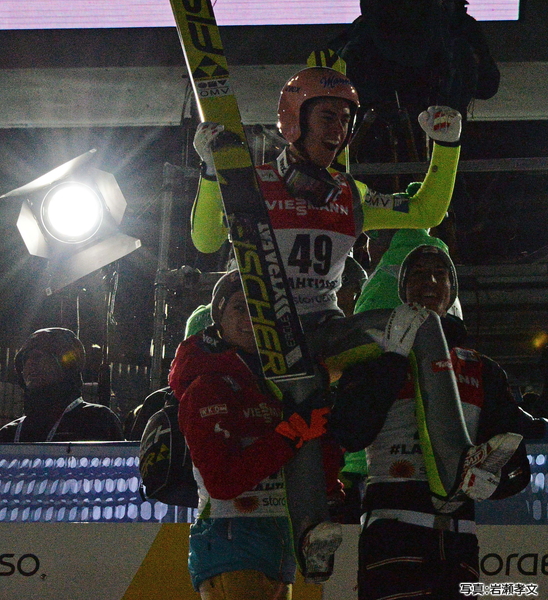フライングのビケルスンで、葛西紀明(土屋ホーム)がしっかりと風を受けて241.5mの偉大なフライトを記録、なんと第2位の表彰台に立った。しかも、伊東大貴(雪印メグミルク)が243mの日本最高記録を打ち出したのだから素晴らしい。