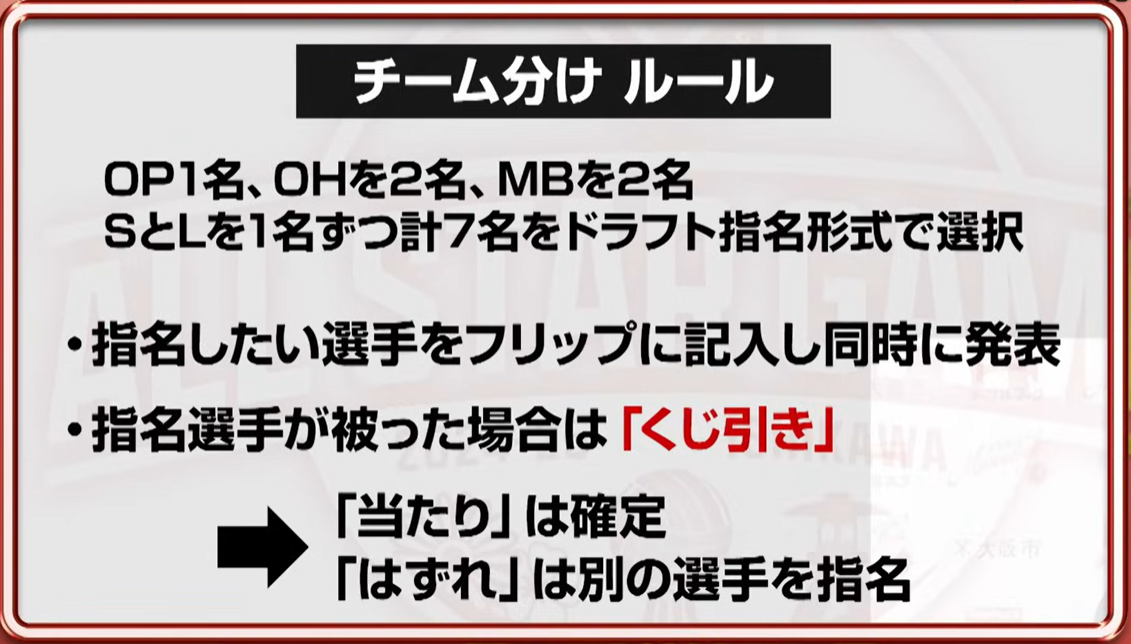 今回のドラフト会議はオポジット1人、アウトサイドヒッター2人、ミドルブロッカー2人、そしてセッターとリベローをそれぞれ1名ずつ、全部で7人の選手を順に選んで行く形式で、どのポジションから選んでもよい。指名したい選手をフリップに書き、同時に発表。指名選手が重なった場合には「くじ引き」となる。