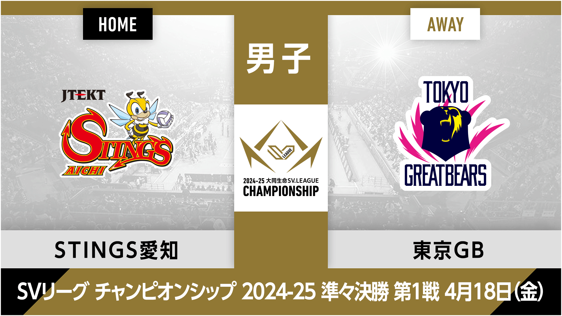 男子のチャンピオンシップには、レギュラーシーズンで4位に入ったジェイテクトSTINGS愛知と、5位の東京グレートベアーズが先陣を切って登場する。戦いの舞台は、STINGS愛知のホーム『岡崎中央総合公園 武道館』。
