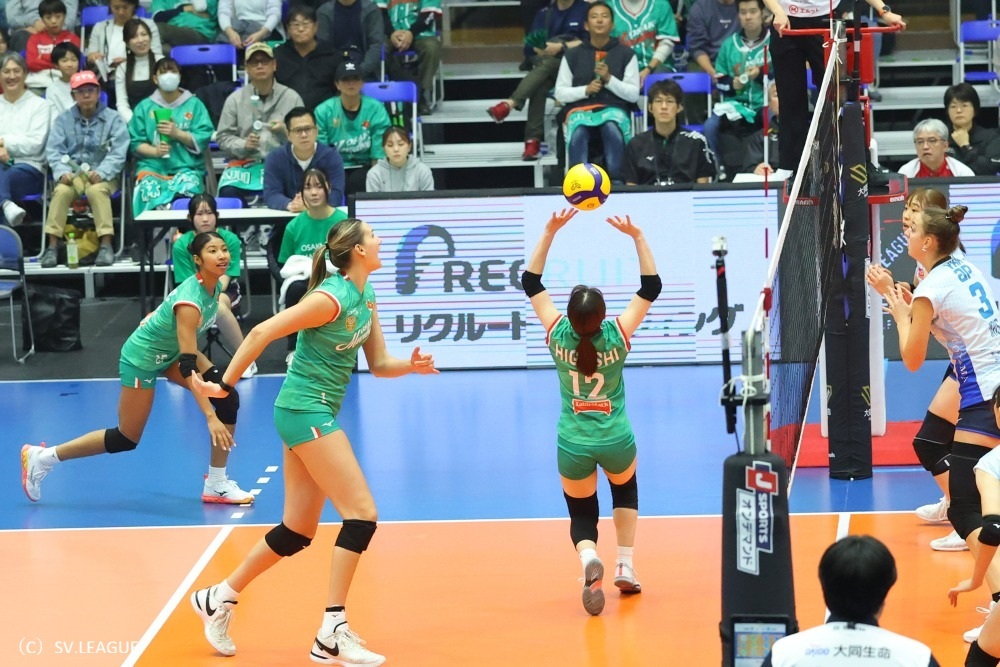 埼玉上尾はチームとしてアタック決定率が上がらない中、黒後愛がチームトップの決定率をマークしたアタックに加え、ブロックとサーブでも得点するプレーでチームを牽引した。