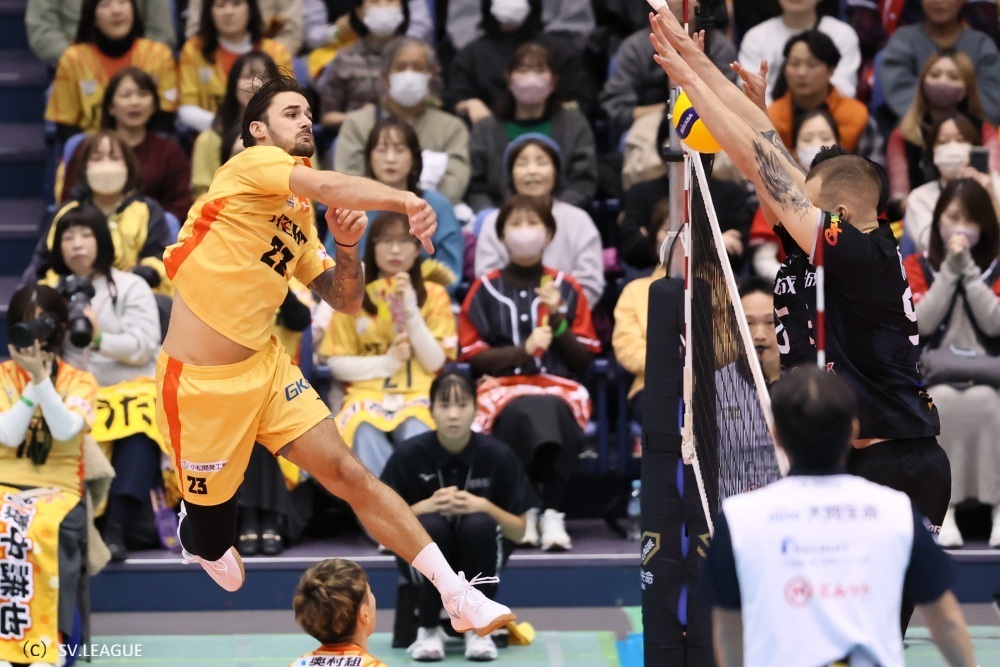 昨季セミファイナルのリターンマッチとなった対戦は、GAME1の序盤から一進一退の好勝負となるなか、粘り強いディフェンスで相手を上回った大阪MVが第1セットと第2セットをともに26-24で奪取すると、勢いそのままに第3セットも奪い、ストレートで難敵を下すことに成功する。