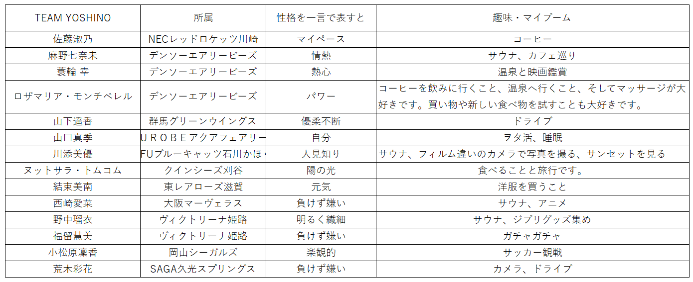 これに対し、『TEAM NICHIKA』の「サウナ」好きは1人のみ(大元 朱菜)。いや、別にサウナ好きの多さを競っているわけではないので、そればどうでもいいのかもしれないが、その他の選手たちの趣味を見ても、「音楽を聴くこと」(花岡 千聡)、「家具などを見ること」(林)、「1人旅行」(岩澤)、「キーホルダー作り」(和田)、「野球観戦」(西村)、「編み物」(トゥイー)、「うどん屋巡り」(平山 詩嫣)などと、見事に被っていない。