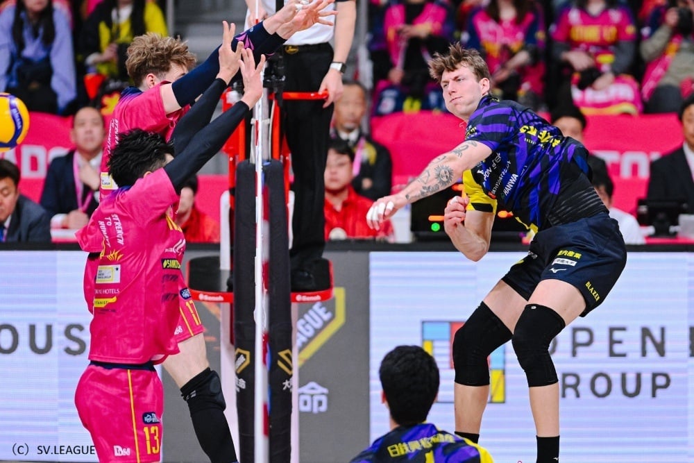 GAME2は一転してAstemoが序盤から攻勢に出る展開となり、セットカウント2-1として第4セットを迎える。しかし、ディフェンス力で上回るSAGA久光は、強固なブロック&ディフェンスから流れを取り戻して第4セットを奪取すると、勢いそのままに第5セットも連取。